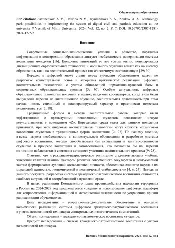 Обсуждение и заключения. В настоящее время в вузах назрела необходимость в концептуальном обосновании и разработке системы цифрового воспитания, которая способствовала бы активизации и заинтересованности студентов в процессе воспитания и самовоспитания. Система гражданско-патриотического воспитания будет реализована с учетом возможностей оборудования технопарка: VR-технологии, робототехника, 3D-моделирование и др. Разрабатываемая система цифрового гражданско-патриотического воспитания включает такие цифровые воспитательные технологии, как: виртуальные экскурсии, видеоресурсы, социальные и гражданско-ориентированные проекты, веб-квесты, культурно-исторические интернет-порталы и др.