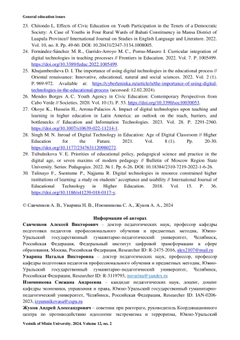 29. Tsibulnikova V. E. Priorities of educational policy, pedagogical science and practice in the digital age, or seven maxims of modern pedagogy // Bulletin of Moscow Region State University. Series: Pedagogics. 2022. № 1. Pp. 6-26. https://doi.org/10.18384/2310-7219-2022-1-6-26.
