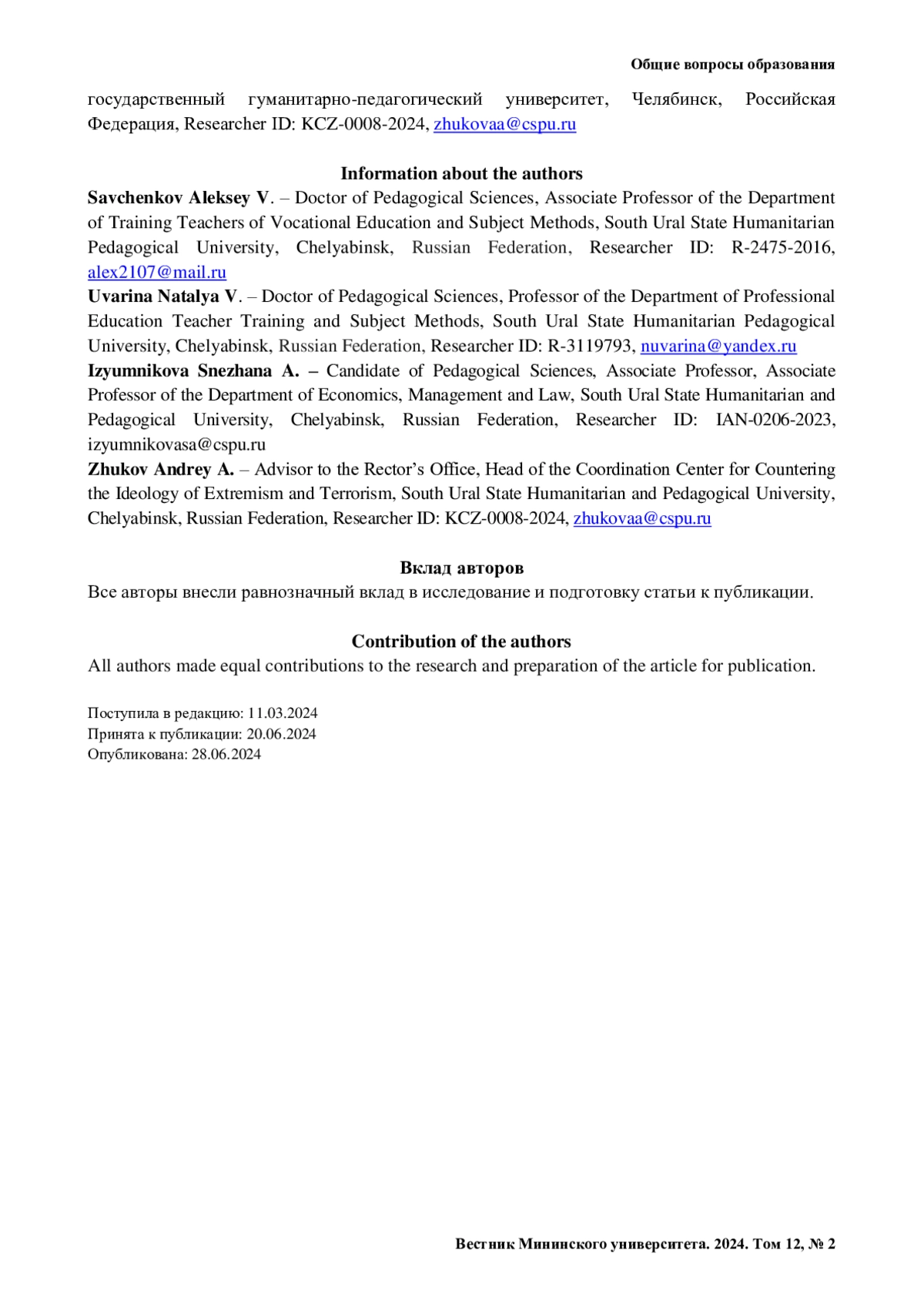 13. Савченков А. В., Уварина Н. В. Система подготовки будущих педагогов профессионального обучения к осуществлению воспитательной деятельности // Известия Российской академии образования. 2023. № 1 (61). С. 99-113. URL: https://www.elibrary.ru/item.asp?id=53757897 (дата обращения: 12.02.2024).