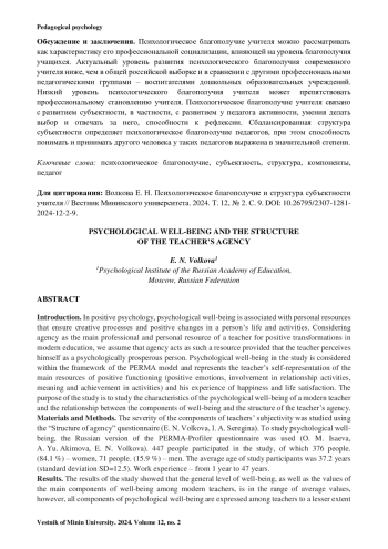 Введение. В позитивной психологии психологическое благополучие связывается с личностными ресурсами, обеспечивающими созидательные процессы и позитивные изменения в жизни и деятельности человека. Рассматривая субъектность как основной профессионально-личностный ресурс учителя для позитивных трансформаций в современном образовании, мы предполагаем, что таковым ресурсом субъектность выступает при условии восприятия учителем себя как психологически благополучного человека. Психологическое благополучие в исследовании рассматривается в рамках модели PERMA и представляет собой саморепрезентацию учителем основных ресурсов позитивного функционирования (позитивных эмоций, вовлеченности в деятельность взаимоотношений, смысла и достижения в деятельности) и переживания им счастья и удовлетворенности жизнью. Цель исследования – изучение особенностей психологического благополучия современного учителя и взаимосвязи компонентов благополучия и структуры субъектности педагога.