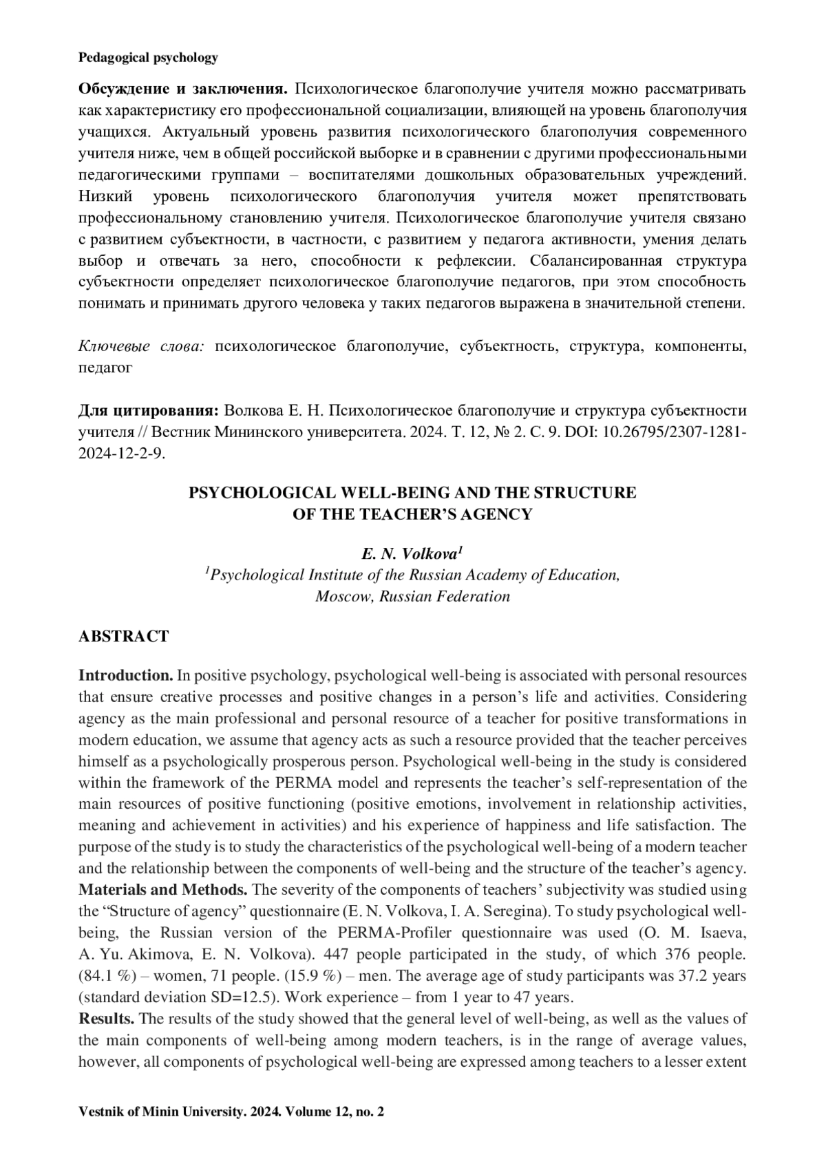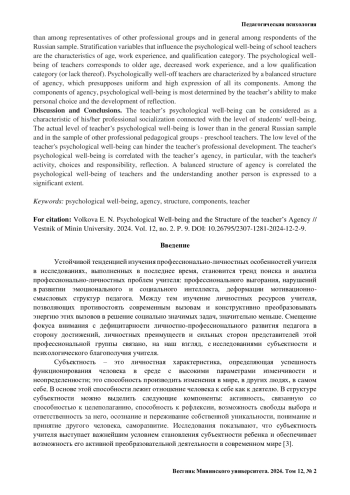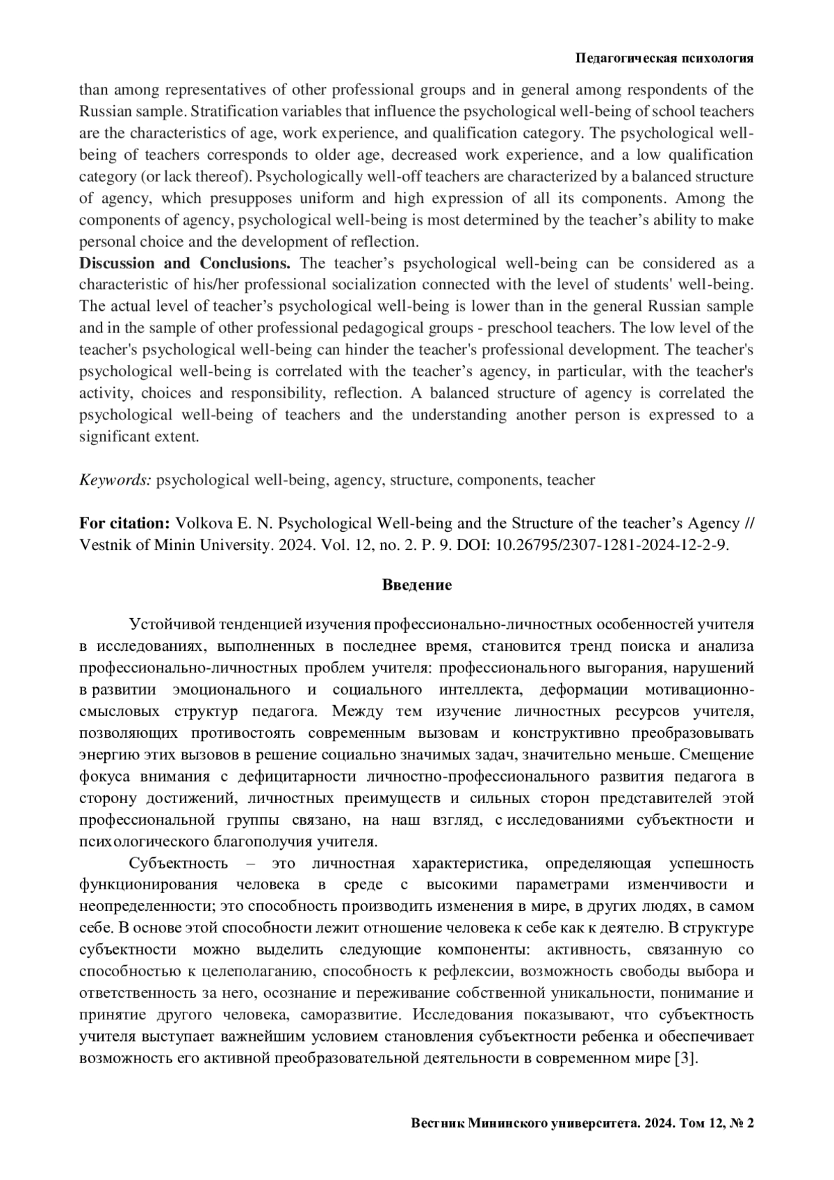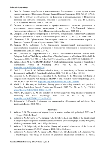 1. Волкова Е. Н. Структура субъектности современного педагога // Мир психологии. 2023. № 2 (113). С. 52-60.