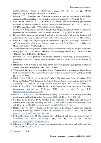 4. Волкова Е. Н., Руднова Н. А., Исаева О. М., Акимова А. Ю., Корниенко Д. С., Семенов Ю. И. Психологическое благополучие воспитателей дошкольных образовательных учреждений России // Психологическая наука и образование. 2023. Т. 28, № 3. C. 85-100. https://doi.org/10.17759/pse.2023280307.