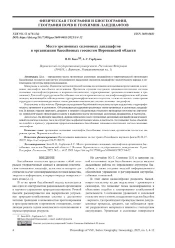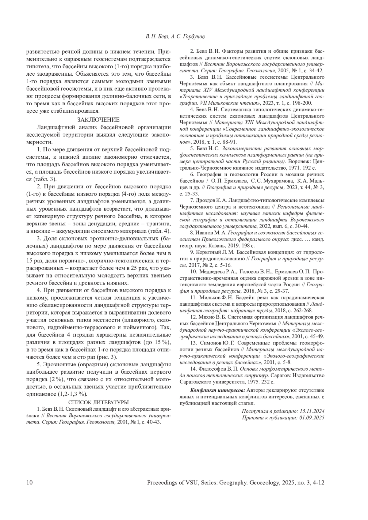 3. 	Бевз В.Н. Бассейновые геосистемы Центрального Черноземья как объект ландшафтного планирования II Материалы XIV Международной ландшафтной конференции “Теоретические и прикладные проблемы ландшафтной географии. VIIМильковские чтения”,2023,т. 1,с. 198-200. EDN: VETICV