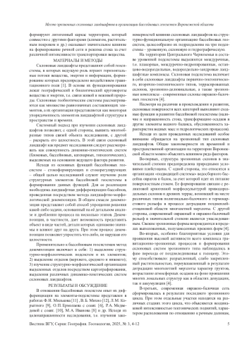 Склоновые ландшафты представляют собой геосистемы, в которых ведущую роль играют горизонтальные потоки вещества, энергии и информации, формирование которых предопределено воздействием гравитационного поля [1]. В основе их функционирования лежат географический и биологический круговороты вещества и энергии, т. е. связи живой и неживой природы. Склоновые геобиотические системы рассматриваются как множество равнозначных составляющих элементов, а их организация представляется как некоторая упорядоченность элементов ландшафтной структуры в пространстве и времени.