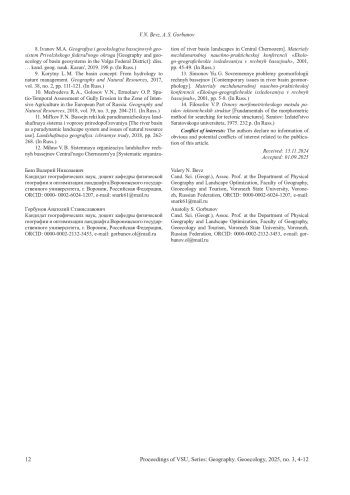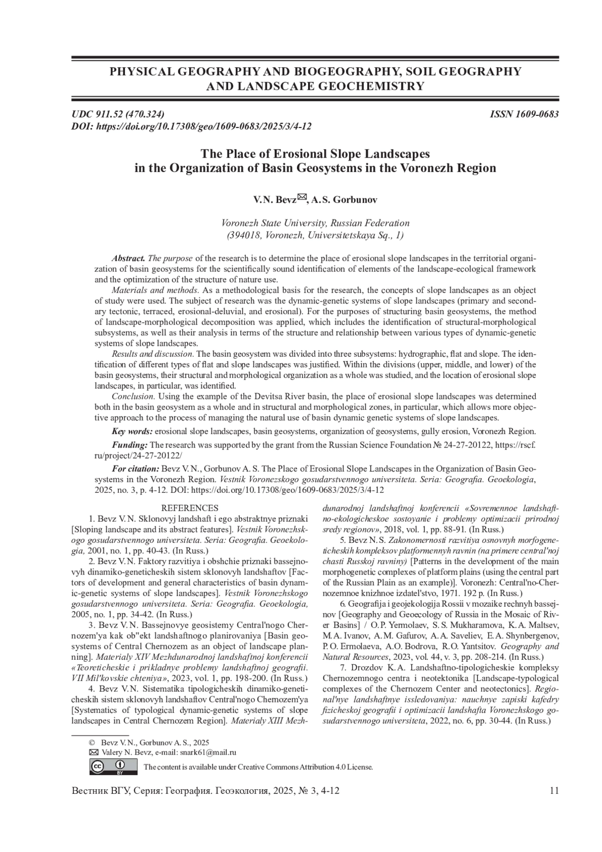 2. 	Бевз В.Н. Факторы развития и общие признаки бассейновых динамико-генетических систем склоновых ландшафтов II Вестник Воронежского государственного университета. Серия: География. Геоэкология, 2005, № 1, с. 34-42. EDN: KAJVQN