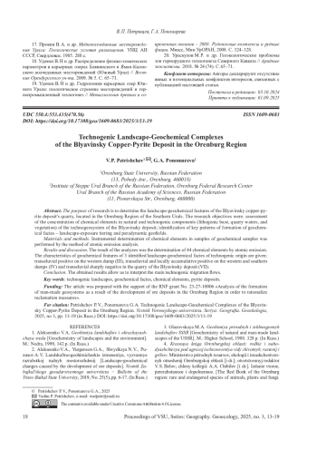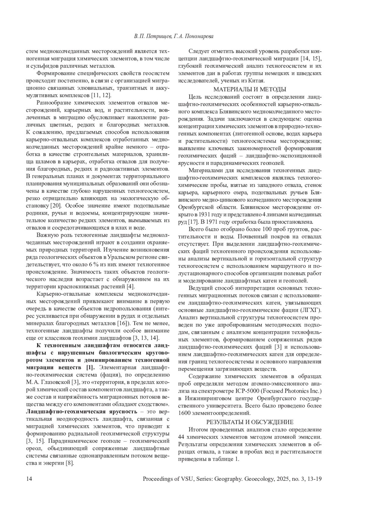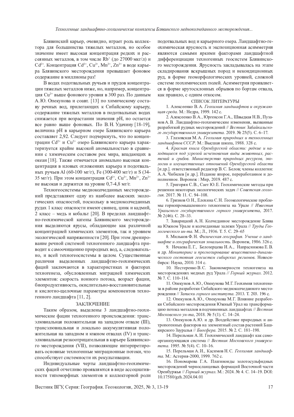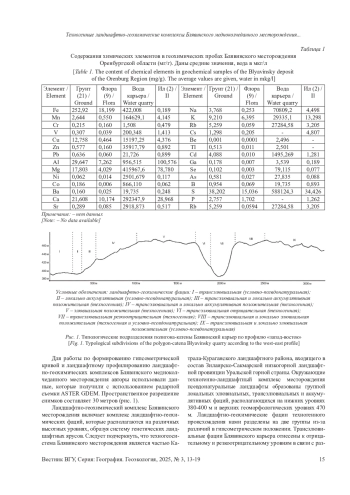 ерно-отвального комплекса Блявинского медноколчеданного месторождения, расположенного в Оренбургской части Южного Урала. Задачи исследования: оценка концентрации химических элементов в природно-техногенных компонентах (литогенной основе, водах карьера и растительности) техногеосистемы Блявинского месторождения; выявление ключевых закономерностей формирования геохимических фаций - ландшафтно-экспозиционной ярус-ности и парадинамических геополей. Материалы и методы. Инструментальное определение химических элементов в образцах геохимических проб выполнено методом атомно-эмиссионного анализа. Результаты и обсуждение. Итогом проведенных анализов стало определение 44 химических элементов методом атомной эмиссии. Приведена характеристика геохимических особенностей 3 выделенных ландшафтно-геохимических фаций техногенного происхождения: трансэлювиальной положительной на западном отвале (III), трансэлювиальной и локально аккумулятивной положительной на западном и южном отвалах (IV) и трансэлювиальной резкоотрицательной в карьере Блявинского месторождения (VII). Заключение. Полученные результаты позволяют интерпретировать основные техногенные миграционные потоки.