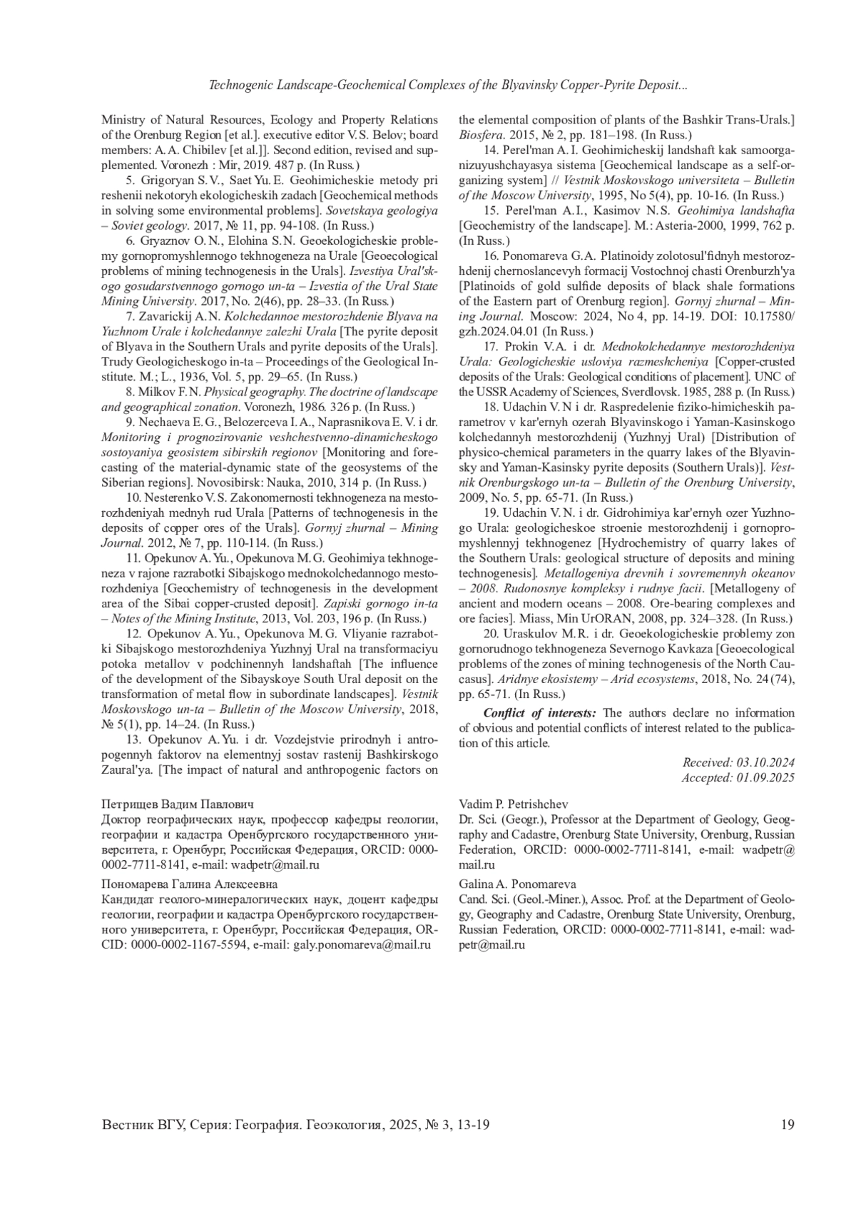 12. 	Опекунов А. Ю., Опекунова М. Г. Влияние разработки Сибайского месторождения Южный Урал на трансформацию потока металлов в подчиненных ландшафтах II Вестник Московского ун-та, 2018. № 5(1). С. 14-24.