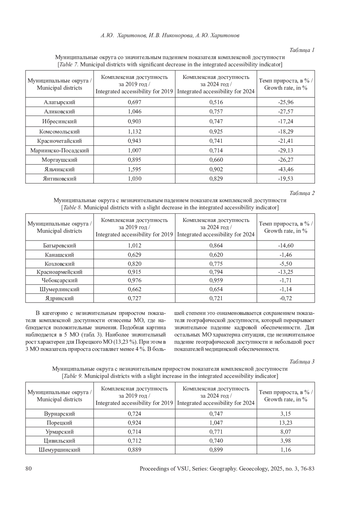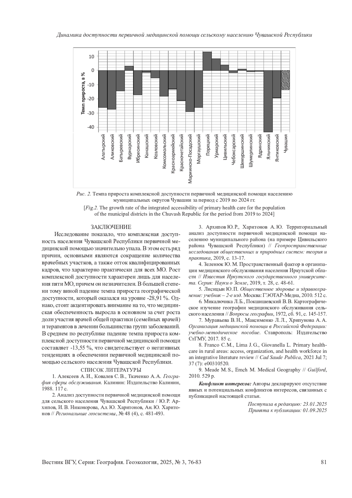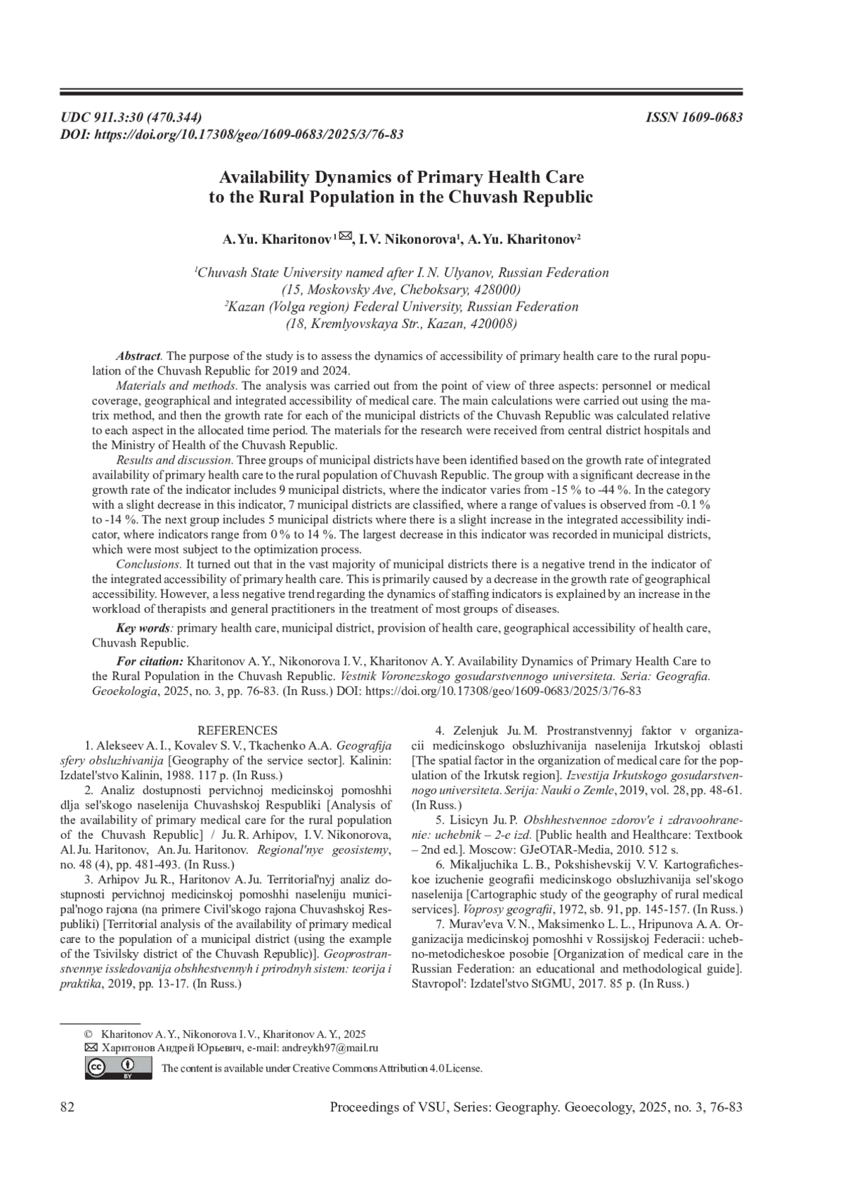 2. 	Анализ доступности первичной медицинской помощи для сельского населения Чувашской Республики / Ю.Р. Архипов, И. В. Никонорова, Ал.Ю. Харитонов, Ан.Ю. Харитонов II Региональные геосистемы, № 48 (4), с. 481-493.