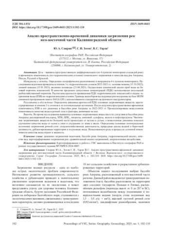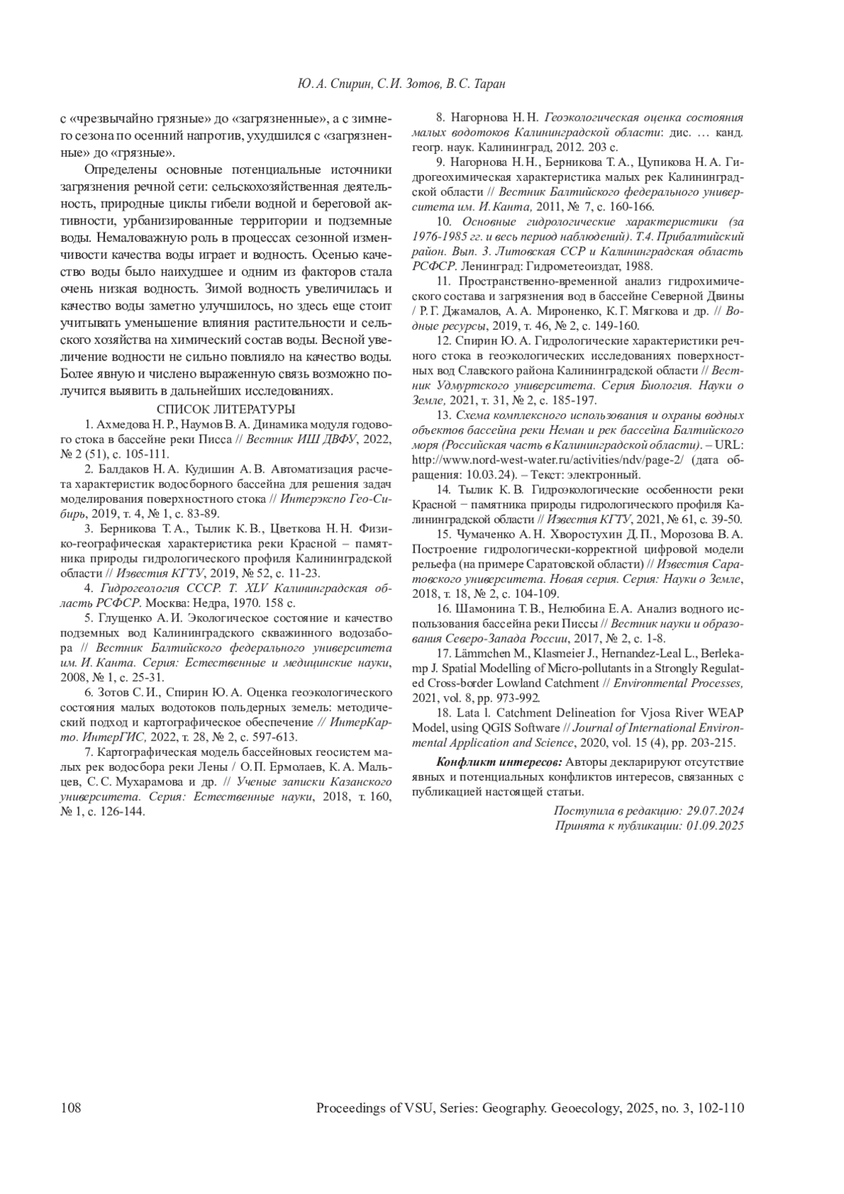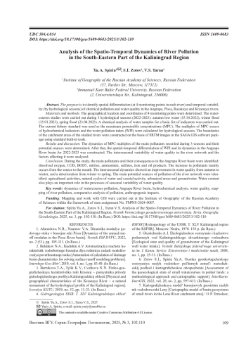 12. 	Спирин Ю.А. Гидрологические характеристики речного стока в геоэкологических исследованиях поверхностных вод Славского района Калининградской области II Вестник Удмуртского университета. Серия Биология. Науки о Земле, 2021, т. 31, №2, с. 185-197. EDN: XTWWBI