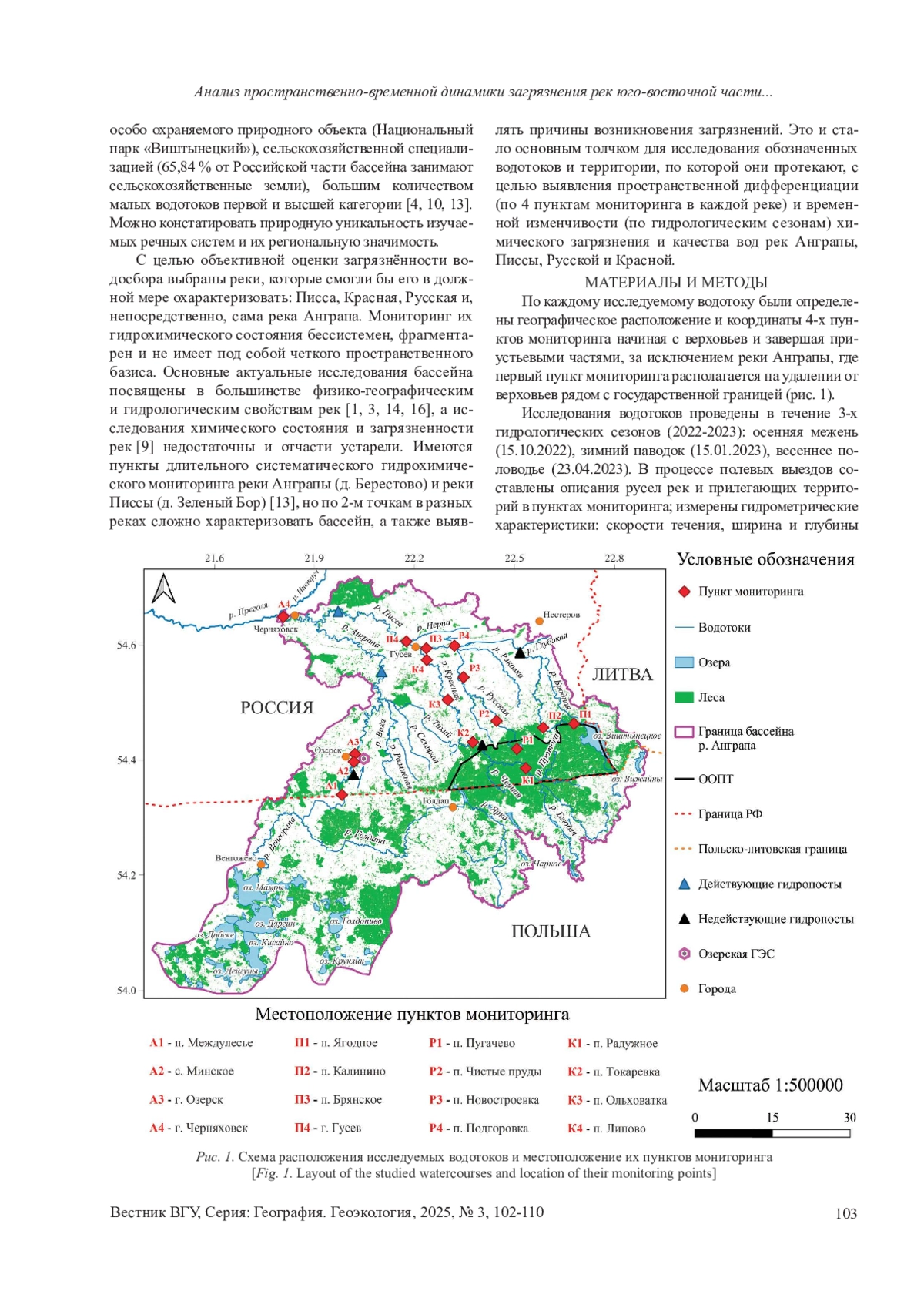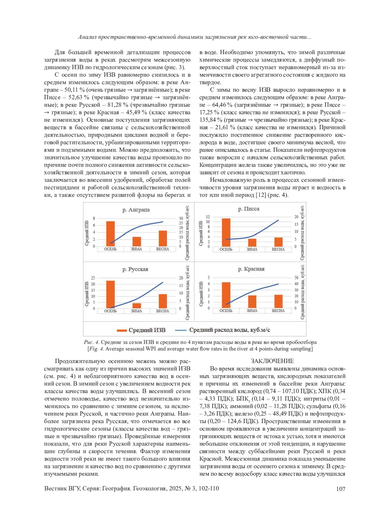 Цель - выявить пространственную дифференциацию (по 4 пунктам мониторинга в каждой реке) и временную изменчивость (по гидрологическим сезонам) химического загрязнения и качества вод рек Антраль Писсы, Русской и Красной. Материалы и методы. Определено географическое расположение и координаты 4-х пунктов мониторинга. Исследования водотоков проведены в течение 3-х гидрологических сезонов 2022-2023 гг.: осенняя межень (15.10.2022), зимний паводок (15.01.2023), весеннее половодье (23.04.2023). Осуществлен химический анализ проб воды на базовый перечень показателей. В качестве предельно допустимых концентраций (ПДК) использовался актуальный рыбохозяйственный норматив. Рассчитаны кратности превышения ПДК гидрохимических показателей и индекс загрязнения воды (ИЗВ) по гидрологическим сезонам. Границы водосборов исследуемых рек построены на базе SRTM снимков в программном пакете SAGA GIS с использованием стандартного встроенного инструментария. Результаты и обсуждение. Определена динамика кратностей ПДК основных загрязняющих веществ, зарегистрированных в течении 3-х сезонов и их потенциальные источники. После получена пространственно-временная изменчивость ИЗВ и его динамика в бассейне реки Анграпы за 2022-2023 гг. Проанализирована межсезонная изменчивость качества воды в речной сети и факторы, влияющие на нее. Выводы. Во время исследования выявлены основные загрязняющие вещества и их следствия в бассейне реки Анграпы: растворенный кислород, ХПК, БПК5, нитриты, аммоний, сульфаты, железо и нефтепродукты. Увеличение загрязняющих веществ по большей части происходит от истока к устью, а межсезонная динамика показала улучшение качества воды от осени к зиме и ухудшение от зимы к весне. Определены основные потенциальные источники загрязнения речной сети: сельскохозяйственная деятельность, природные циклы водной и береговой активности, урбанизированные территории и подземные воды. Немаловажную роль в процессах сезонной изменчивости качества воды играет и водность.