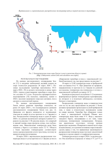 По данным дистанционнного зондирования Земли начало развития термобара отмечалось не ранее 26 марта 2024 г., что подтверждается данными дистанционного зондирования Земли (см. рис. 2). Движение его фронта начинается от мелководных участков на севере (в устье протоки из оз. Свядово) и юге. Распределение температур воды и суши 26 марта 2024 г. по данным космического аппарата Landsat 8 отражено на рисунке 2. Из рисунка видно, что северный и южный заливы озера прогреты лучше, чем глубоководная зона. Максимальная температура воды была отмечена у берега и составила около 5,5 ℃. Области с более высокими температурами соответствуют полосе распространения сухого тростника, поэтому не являются репрезентативными.