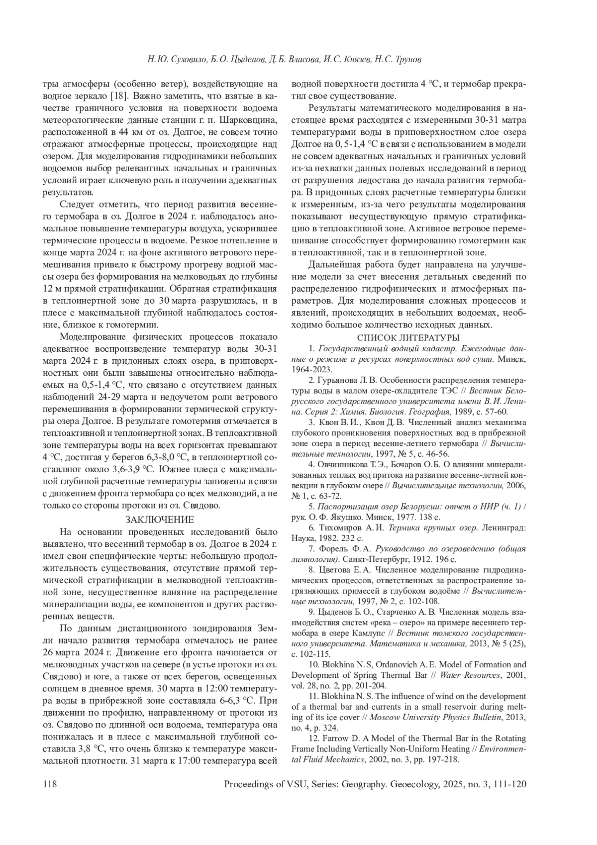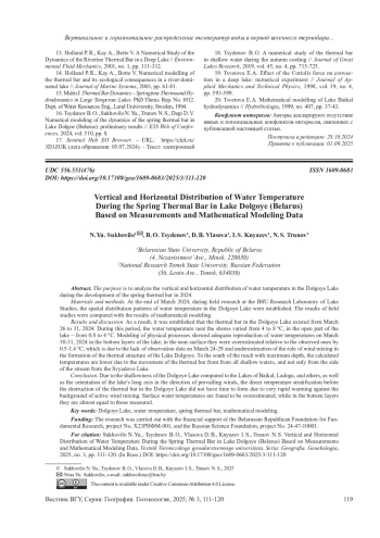 16. 	Tsydenov B. O., Sukhovilo N. Yu., Trunov N. S., Degi D. V. Numerical modeling of the dynamics of the spring thermal bar in Lake Dolgoe (Belarus): preliminary results IIE3S Web of Conferences, 2024, vol. 510, рр. 8. EDN: ENQHPV