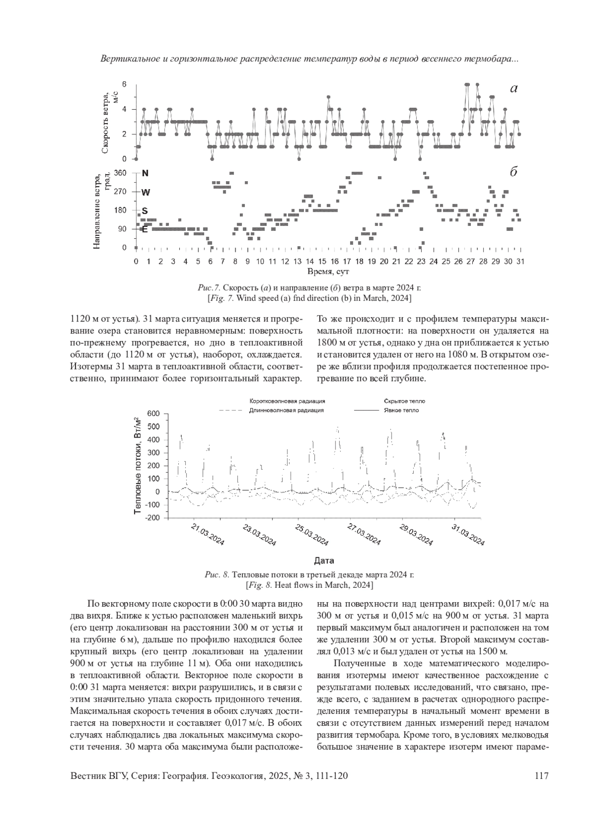 Цель - анализ вертикального и горизонтального распределения температуры воды в озере Долгое в период развития весеннего термобара 2024 г. Материалы и методы. В конце марта 2024 г. в ходе полевых исследований научно-исследовательской лаборатории озероведения БГУ были установлены закономерности пространственного распределения температуры воды в озере Долгое. Результаты полевых исследований сравнивались с результатами математического моделирования. Результаты и обсуждение. В результате установлено, что термобар в озере Долгое существовал с 26 по 31 марта 2024 г. Температура воды в этот период у берегов менялась от 4 до 8 °С, в открытой части водоема - от 0,8 до 4 °С. Моделирование физических процессов показало адекватное воспроизведение температур воды 3031 марта 2024 г. в придонных слоях озера, в приповерхностных они были завышены относительно наблюдаемых на 0,5-1,4 °С, что связано с отсутствием данных наблюдений 24-29 марта и недоучетом роли ветрового перемешивания в формировании термической структуры озера Долгое. Южнее плеса с максимальной глубиной расчетные температуры занижены в связи с движением фронта термобара со всех мелководий, а не только со стороны протоки из озера Свядово. Выводы. Из-за мелководности по сравнению с озерами Байкал, Ладожским и др., а также ориентации длинной оси озера по направлению преобладающих ветров, прямая температурная стратификация до разрушения термобара в озере Долгое сформироваться не успела по причине очень быстрого потепления на фоне активного ветрового перемешивания. Температуры воды в приповерхностных слоях оказываются завышены, в придонных почти не отличаются от измеренных.