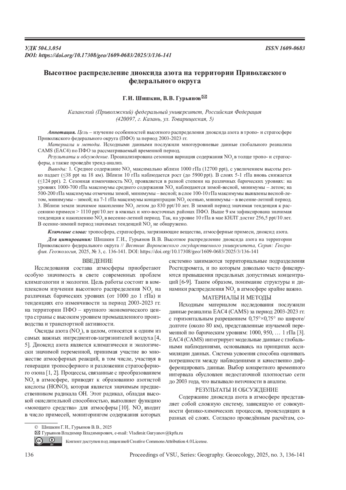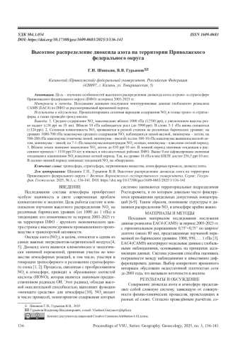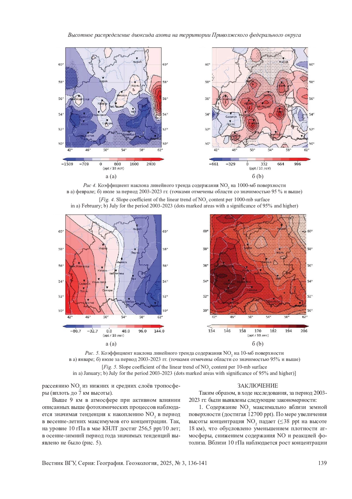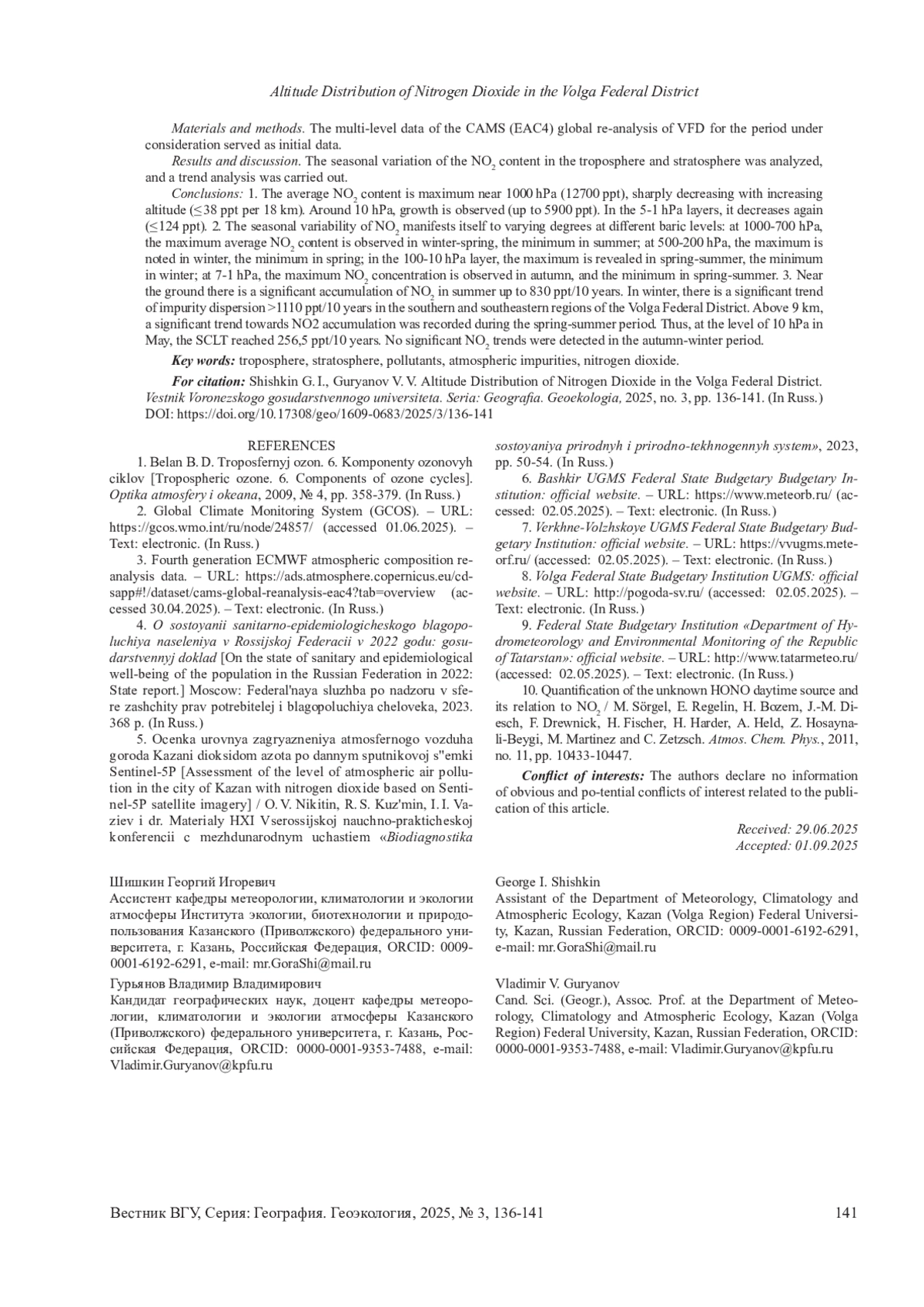Цель - изучение особенностей высотного распределения диоксида азота в тропо- и стратосфере Приволжского федерального округа (ПФО) за период 2003-2023 гг. Материалы и методы. Исходными данными послужили многоуровневые данные глобального реанализа CAMS (ЕАС4) по ПФО за рассматриваемый временной период. Результаты и обсуждение. Проанализирована сезонная вариация содержания Ы02в толще тропо- и стратосферы, а также проведён тренд-анализ. Выводы: 1. Среднее содержание N02 максимально вблизи 1000 гПа (12700 ppt), с увеличением высоты резко падает (<38 ppt на 18 км). Вблизи 10 гПа наблюдается рост (до 5900 ppt). В слоях 5-1 гПа вновь снижается (<124 ppt). 2. Сезонная изменчивость N02 проявляется в разной степени на различных барических уровнях: на уровнях 1000-700 гПа максимумы среднего содержания N02 наблюдаются зимой-весной, минимумы - летом; на 500-200 гПа максимумы отмечены зимой, минимумы - весной; в слое 100-10 гПа максимумы выявлены весной-летом, минимумы - зимой; на 7-1 гПа максимумы концентрации N02 осенью, минимумы - в весенне-летний период. 3. Вблизи земли значимое накопление N02 летом до 830 ppt/10 лет. В зимний период значимая тенденция к рассеянию примеси >1110 ppt/10 лет в южных и юго-восточных районах ПФО. Выше 9 км зафиксирована значимая тенденция к накоплению Ы02в весенне-летний период. Так, на уровне 10 гПа в мае КНЛТ достиг 256,5 ppt/10 лет. В осенне-зимний период значимых тенденций N02 не обнаружено.