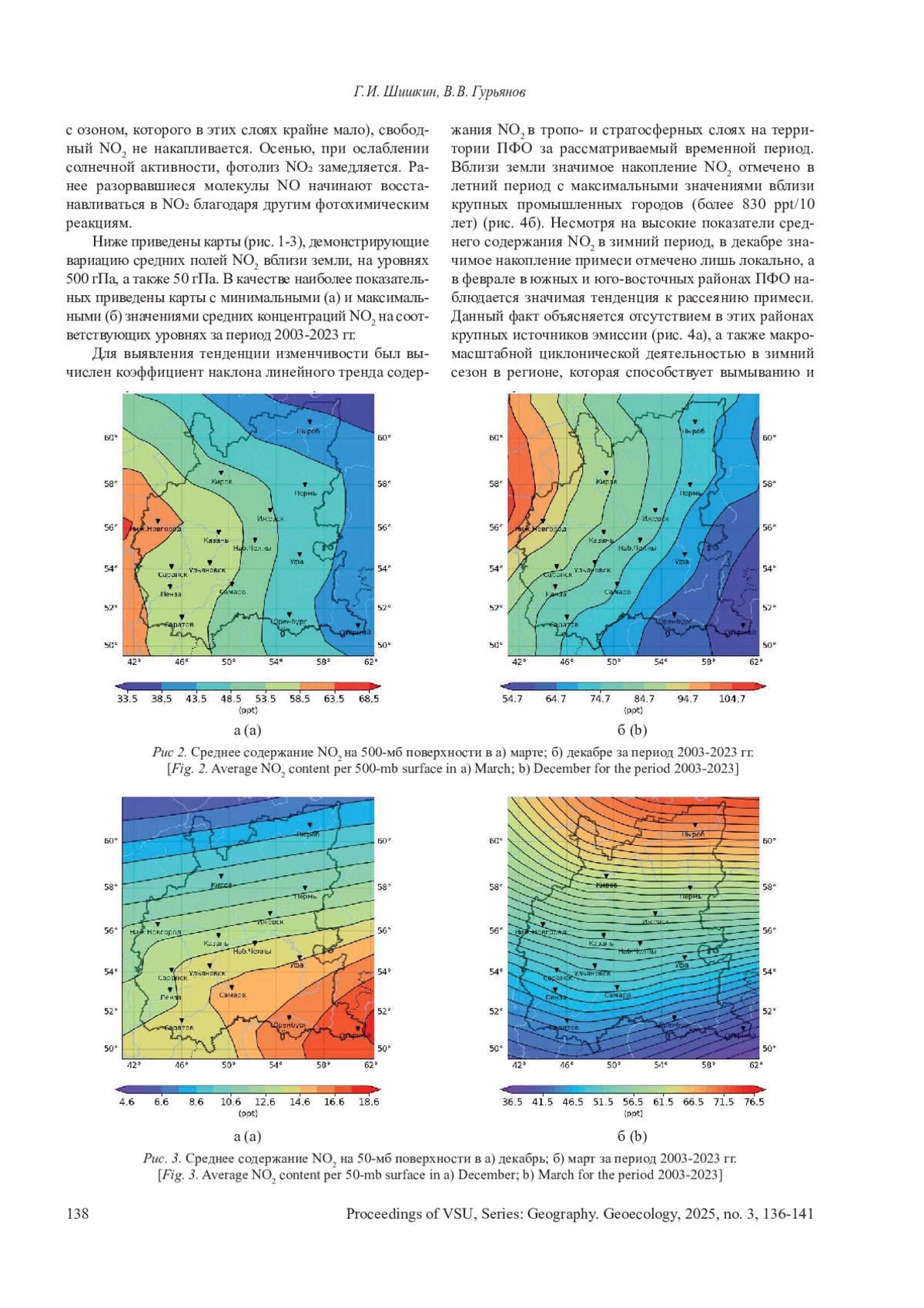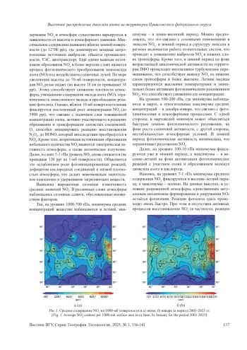 На уровнях 500-200 гПа, где минимумы наблюдаются в марте, а относительные максимумы средних концентраций – в декабре-январе, что связано с фотохимическими и атмосферными процессами. С одной стороны, в мартовский минимум может объясняться быстрым темпом фотохимического разложения, на фоне роста солнечной активности, с другой стороны, нестабильностью атмосферных условий. В зимний период фотохимическая активность минимальна, что ограничивает разложение NO2.