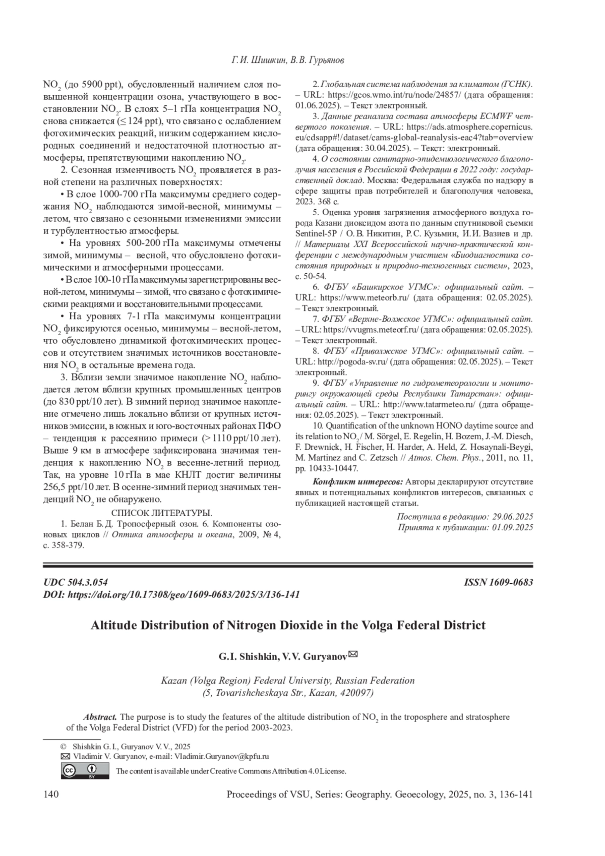 5. 	Оценка уровня загрязнения атмосферного воздуха города Казани диоксидом азота по данным спутниковой съемки Sentinel-5P / О. В. Никитин, Р.С. Кузьмин, И. И. Вазиев и др. II Материалы ХХ1 Всероссийской научно-практической конференции с международным участием “Биодиагностика состояния природных и природно-техногенных систем”, 2023, с. 50-54. EDN: DEIDCJ