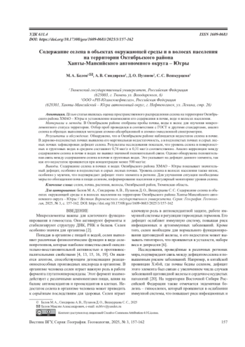 Особый интерес и практическую значимость такие исследования представляют для регионов с неблагоприятными условиями окружающей среды. Ханты-Мансийский автономный округ – Югра (ХМАО – Югра) – это регион с суровыми условиями для жизни. Здесь длинные и холодные зимы, резкие изменения температуры и давления, недостаток солнечного света и геомагнитные возмущения. Эти факторы усугубляются дисбалансом химических элементов в почве, воде и растениях [5, 15, 18-20]. Исследования [1, 6, 12] неоднократно подчеркивали, что жители северных регионов испытывают дефицит витаминов и микроэлементов, особенно тех, которые обладают антиоксидантными свойствами, таких как селен.
