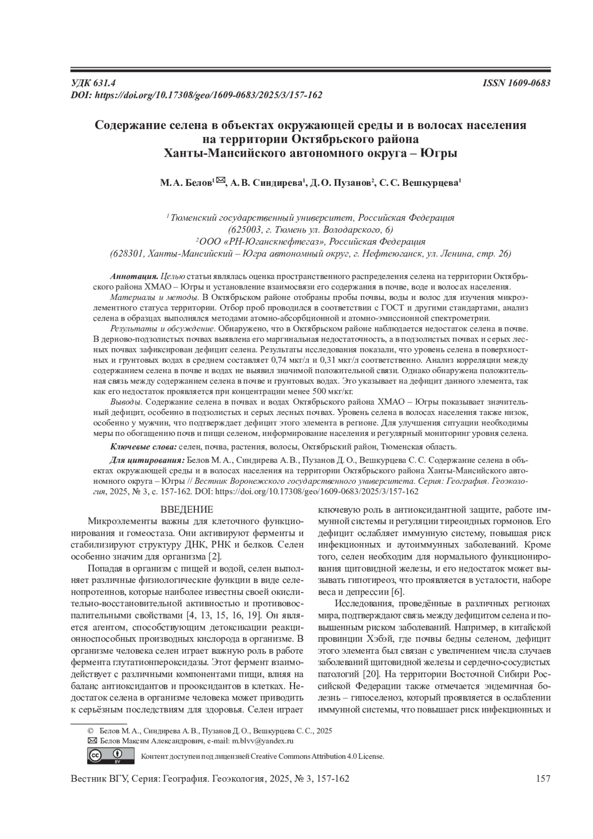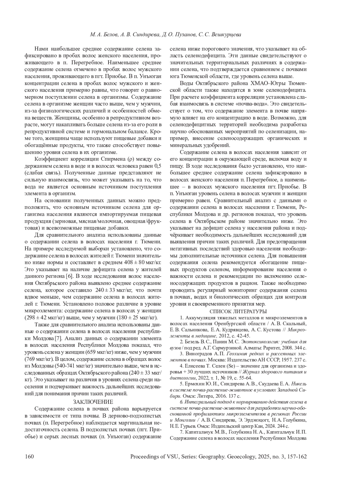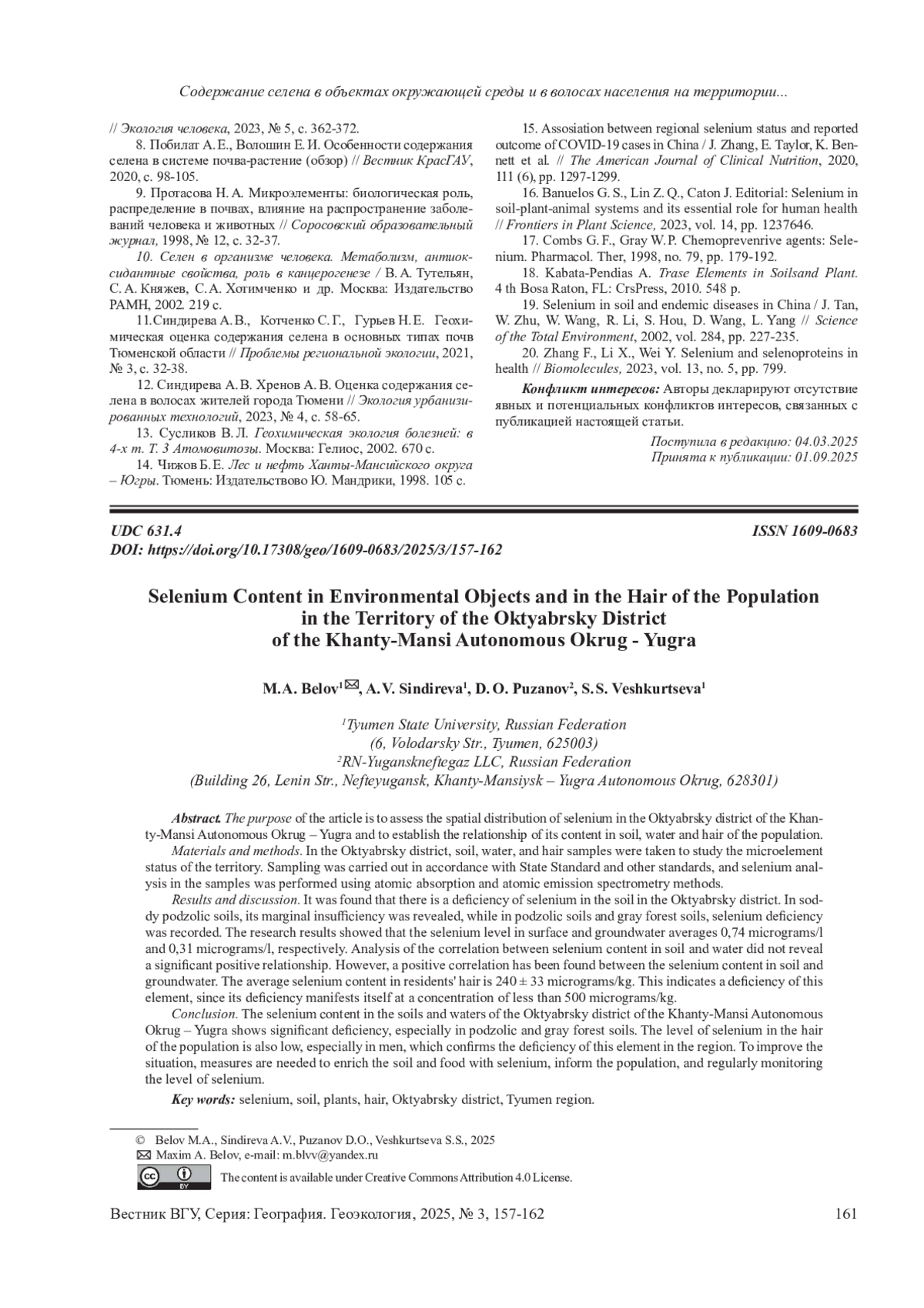 11. 	Синдирева А. В. Хренов А. В. Оценка содержания селена в волосах жителей города Тюмени II Экология урбанизированных технологий, 2023, № 4, с. 58-65.