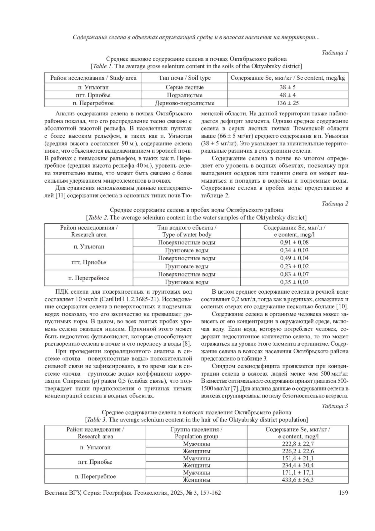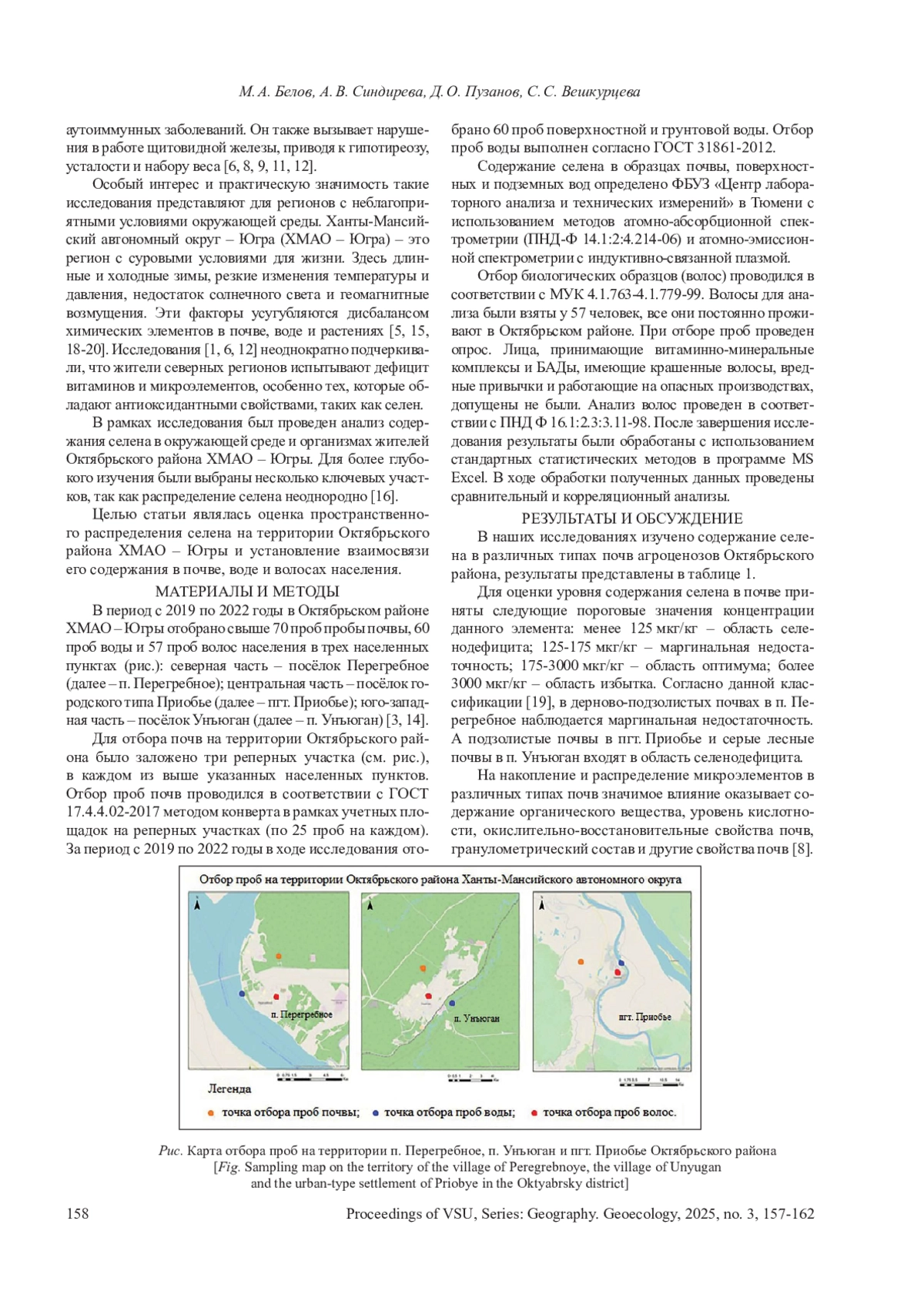 Целью статьи являлась оценка пространственного распределения селена на территории Октябрьского района ХМАО - Югры и установление взаимосвязи его содержания в почве, воде и волосах населения. Материалы и методы. В Октябрьском районе отобраны пробы почвы, воды и волос для изучения микроэлементного статуса территории. Отбор проб проводился в соответствии с ГОСТ и другими стандартами, анализ селена в образцах выполнялся методами атомно-абсорбционной и атомно-эмиссионной спектрометрии. Результаты и обсуждение. Обнаружено, что в Октябрьском районе наблюдается недостаток селена в почве. В дерново-подзолистых почвах выявлена его маргинальная недостаточность, а в подзолистых почвах и серых лесных почвах зафиксирован дефицит селена. Результаты исследования показали, что уровень селена в поверхностных и грунтовых водах в среднем составляет 0,74 мкг/л и 0,31 мкг/л соответственно. Анализ корреляции между содержанием селена в почве и водах не выявил значимой положительной связи. Однако обнаружена положительная связь между содержанием селена в почве и грунтовых водах. Это указывает на дефицит данного элемента, так как его недостаток проявляется при концентрации менее 500 мкг/кг. Выводы. Содержание селена в почвах и водах Октябрьского района ХМАО - Югры показывает значительный дефицит, особенно в подзолистых и серых лесных почвах. Уровень селена в волосах населения также низок, особенно у мужчин, что подтверждает дефицит этого элемента в регионе. Для улучшения ситуации необходимы меры по обогащению почв и пищи селеном, информирование населения и регулярный мониторинг уровня селена.