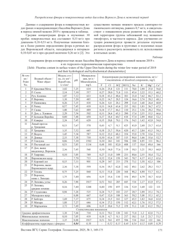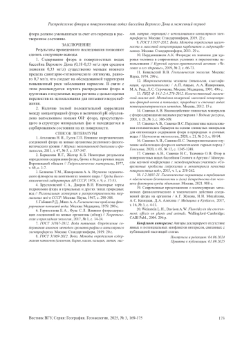 Между содержанием фтора, с одной стороны, а также величиной минерализации и концентрациями компонентов основного солевого состава, с другой, значимые корреляционные связи не прослеживаются (см. табл.). В [2] также указывалось на отсутствие значимой корреляции содержания фтора с минерализацией в поверхностных водах Воронежской области. Вместе с тем следует отметить существование общей тенденции увеличения концентрации фтора с ростом минерализации [4], которая не всегда, а только в отдельных случаях реализуется в форме тесных взаимосвязей [17]. С. А. Брусиловский и В. И. Дворов [4] на примере рек гумидной и семиаридной-аридной зон бывшего СССР, а также рек южных штатов США показали сложный характер функциональной зависимости концентрации фтора от минерализации. При низкой минерализации эта зависимость имеет приближенно линейный вид, но при увеличении минерализации происходит постепенное снижение углового коэффициента и выход на плато.