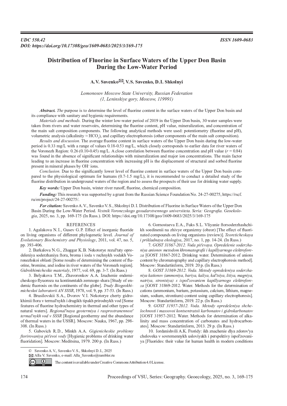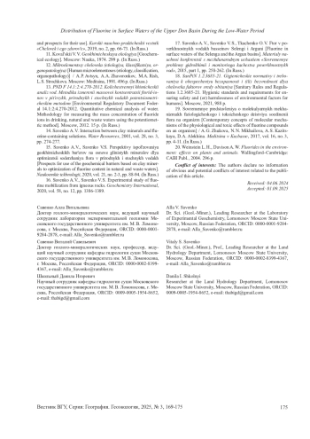 17. 	Савенко А.В., Савенко В. С., Ткаченко О.В. Фтор в поверхностных водах бассейнов Селенги и Аргуни IIМатериалы научной конференции с международным участием “Современные проблемы гидрохимии и мониторинга качества поверхностных вод”, 2015, ч. 1, с. 258-262. EDN: UMRERT