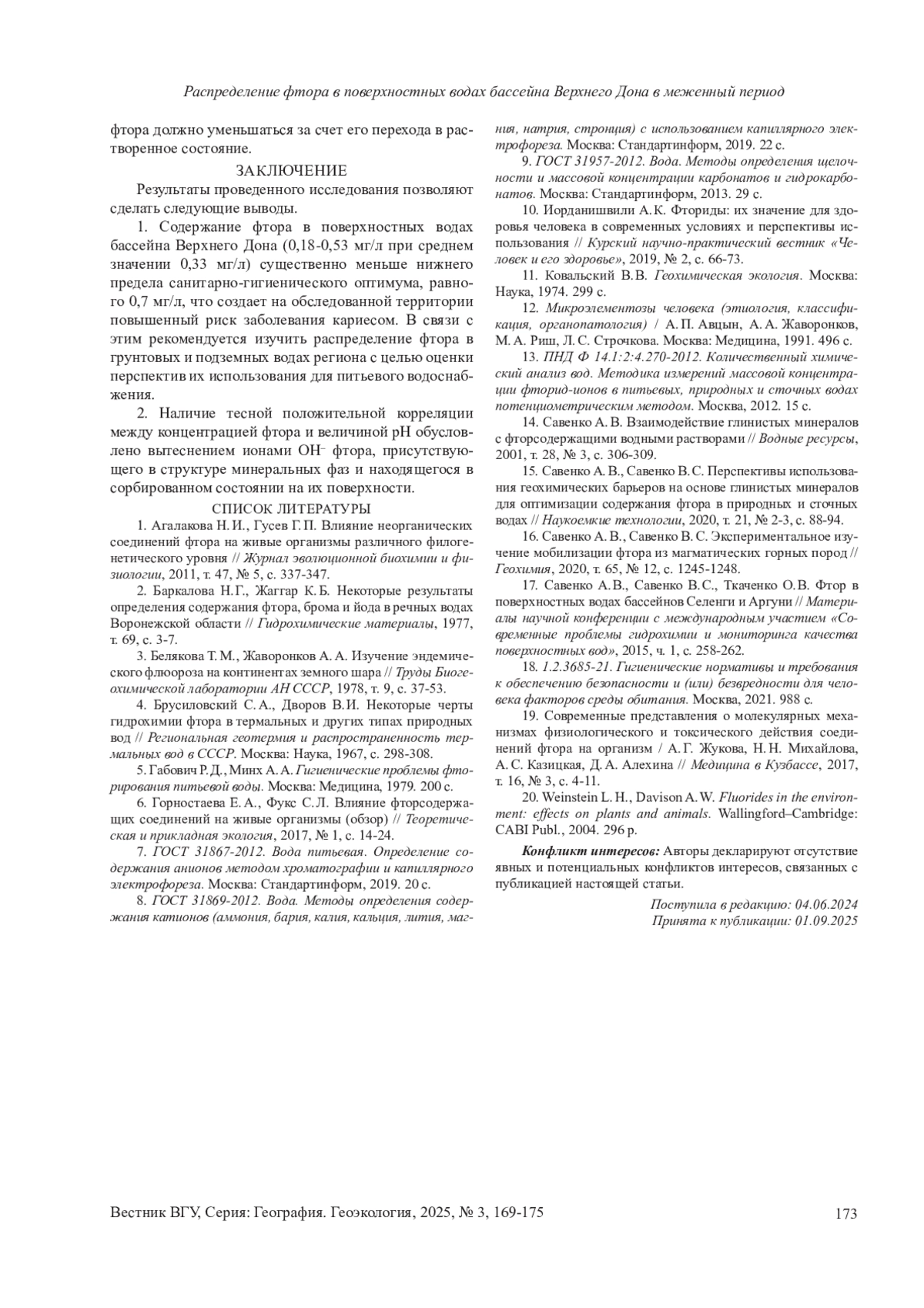 15. 	Савенко А. В., Савенко В. С. Перспективы использования геохимических барьеров на основе глинистых минералов для оптимизации содержания фтора в природных и сточных водах II Наукоемкие технологии, 2020, т. 21, № 2-3, с. 88-94. EDN: XZVSEF