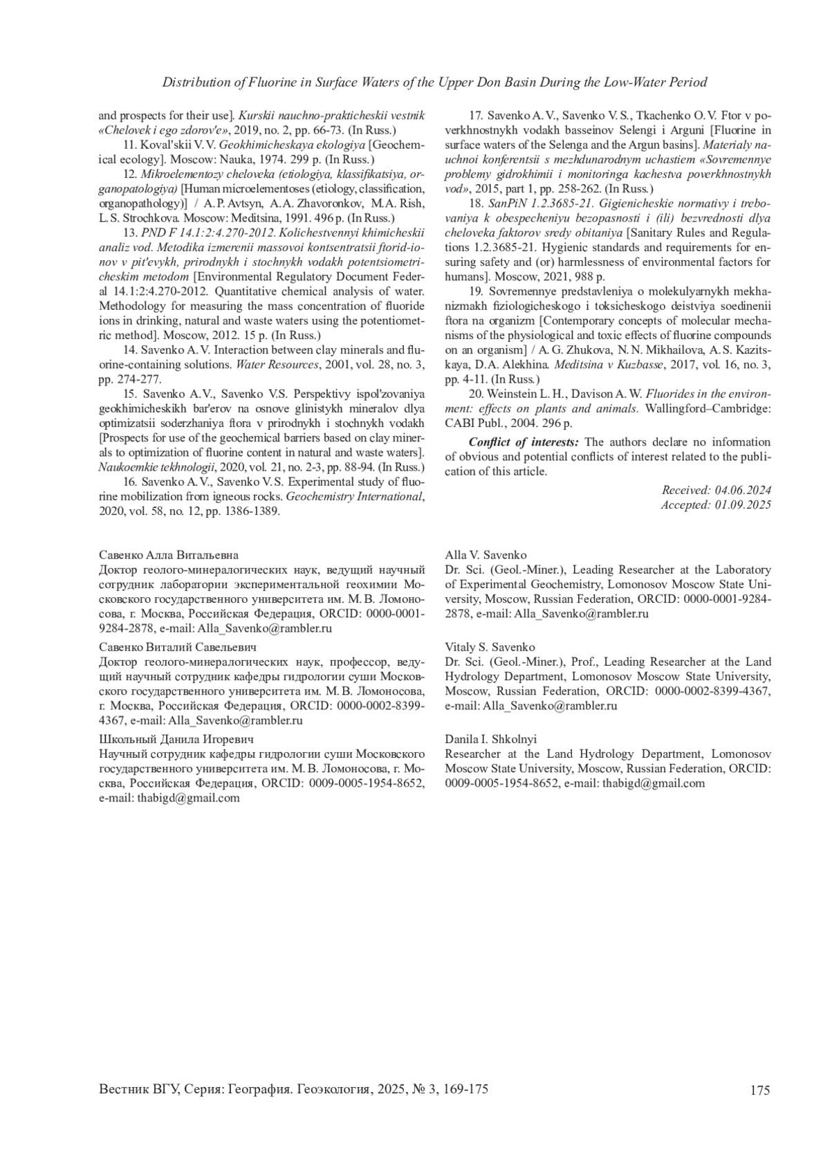 16. 	Савенко А. В., Савенко В. С. Экспериментальное изучение мобилизации фтора из магматических горных пород II Геохимия, 2020, т. 65, № 12, с. 1245-1248. EDN: JUGBYX