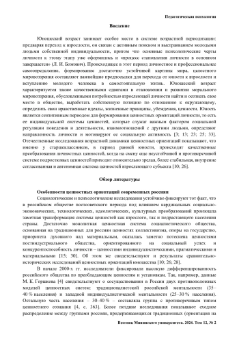 Введение. Юношеский возраст характеризуется качественными преобразованиями ценностной сферы, ее оформлением в автономную и согласованную систему. Ценностные ориентации молодых людей быстрее перестраиваются и адаптируются к меняющимся социокультурным условиям, отражая общие тенденции трансформации общественной системы ценностей. Это определяет актуальность изучения содержания ценностных ориентаций молодежи, а также поиска новых методических подходов к их выявлению.