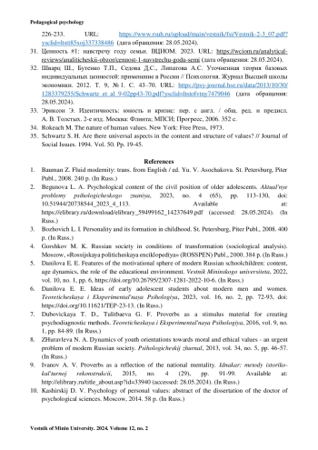 30. Хухарева О. Н. Динамика ценностных ориентаций россиян в постсоветскую эпоху: потери и приобретения // Вестник РГГУ. Серия «Философия. Социология». 2007. № 2-3/07. С. 226-233. URL: https://www.rsuh.ru/upload/main/vestnik/fsi/Vestnik-2-3_07.pdf?ysclid=ltstt85xoj337338486 (дата обращения: 28.05.2024).