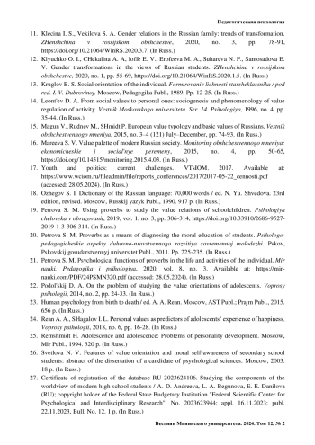 6. Данилова Е. Е. Представления учащихся раннего юношеского возраста о современных мужчинах и женщинах // Теоретическая и Экспериментальная Психология. 2023. Т. 16, № 2. С. 72-93. https://doi.org/10.11621/TEP-23-13.