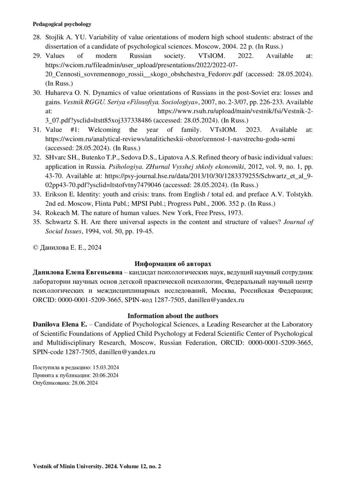 32. Шварц Ш., Бутенко Т.П., Седова Д.С., Липатова А.С. Уточненная теория базовых индивидуальных ценностей: применение в России // Психология. Журнал Высшей школы экономики. 2012. Т. 9, № 1. С. 43-70. URL: https://psy-journal.hse.ru/data/2013/10/30/1283379255/Schwartz_et_al_9-02pp43-70.pdf?ysclid=ltstofvtny7479046 (дата обращения: 28.05.2024).