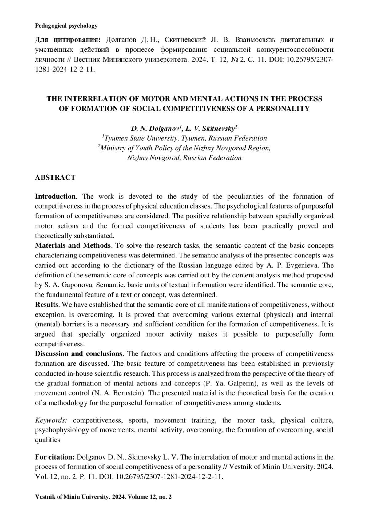 Обсуждение и заключения. Обсуждаются факторы и условия, влияющие на процесс формирования конкурентоспособности. В ранее проведённых собственных научных исследованиях установлен базовый признак конкурентоспособности. Указанный процесс анализируется с позиции теории поэтапного формирования умственных действий и понятий (Гальперин П. Я.), а также уровней управления движениями (Бернштейн Н. А.). Представленный материал является теоретическим основанием создания методики целенаправленного формирования конкурентоспособности у студенческой молодёжи.