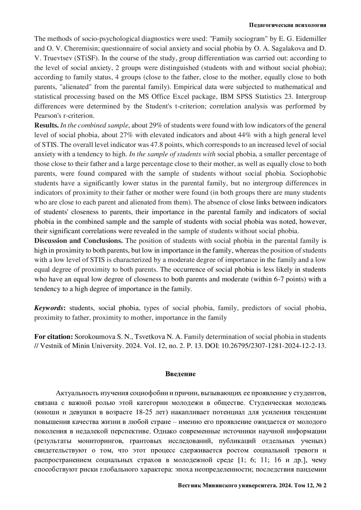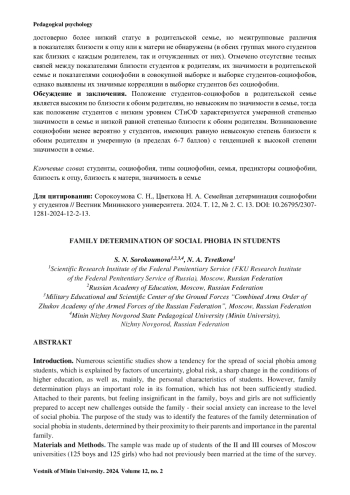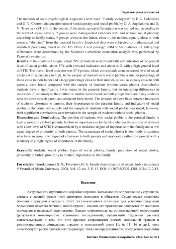 Введение. Многочисленные научные исследования показывают тенденцию распространения социофобии у студенческой молодежи, что объясняется факторами неопределенности, глобального риска, резким изменением условий получения высшего образования, а также, преимущественно, личностными особенностями студентов. Однако большую роль в ее формировании играет семейная детерминация, которая недостаточно изучена. Привязанные к родителям, но ощущающие себя малозначимыми в семье, юноши и девушки оказываются недостаточно подготовленными к принятию новых вызовов вне семьи – их социальная тревога может усилиться до уровня социофобии. Цель исследования заключалась в выявлении особенностей семейной детерминации социофобии у студентов, определяемых по их близости к родителям и значимости в родительской семье.