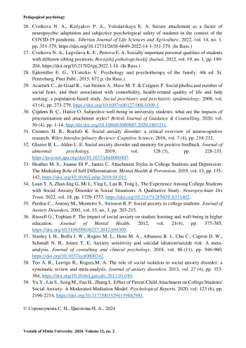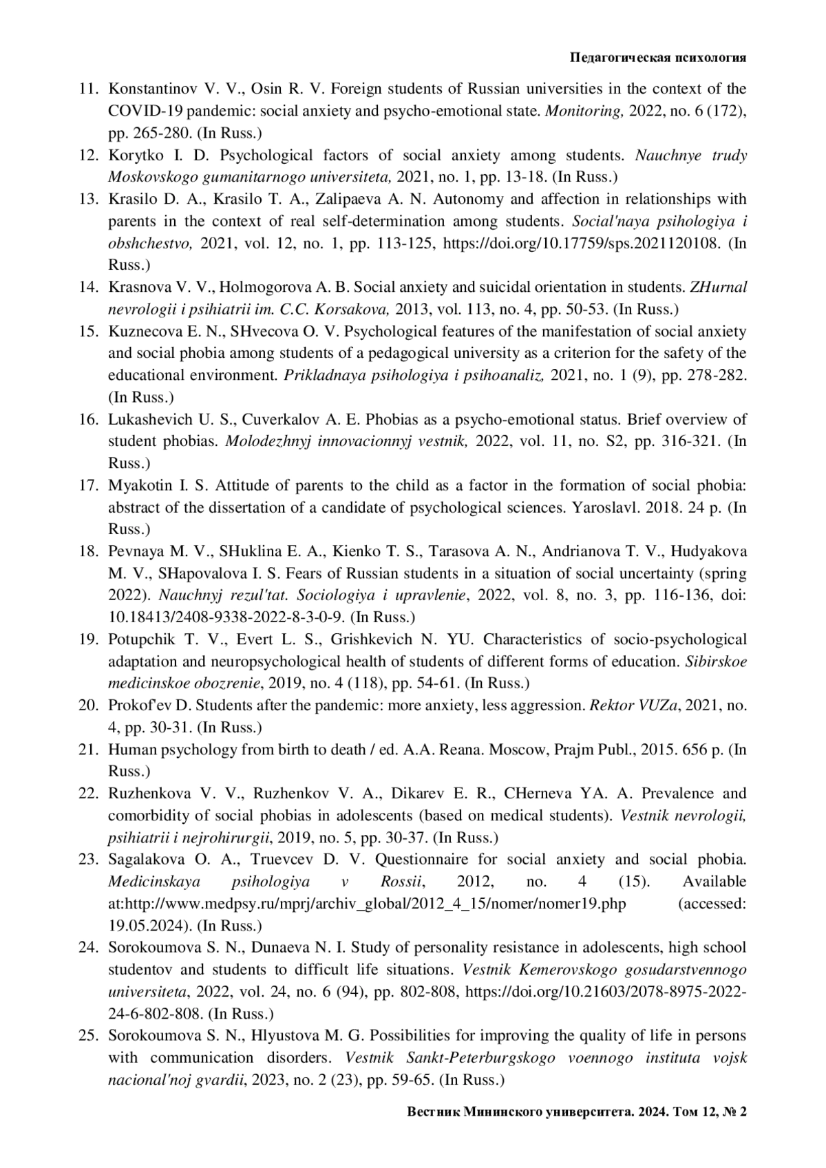 15. Кузнецова Е. Н., Швецова О. В. Психологические особенности проявления социальной тревожности и социофобии у студентов педагогического вуза как критерий безопасности образовательной среды // Прикладная психология и психоанализ. 2021. № 1 (9). С. 278-282.