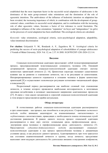 Введение. Систему ценностных ориентаций личности считают основной детерминантой процессов социально-психологической адаптации. Ценностная структура оказывает существенное влияние как на развитие и становление личности, так и на регуляцию ее самосознания, когнитивно-эмоциональной сферы и поведения. В подростковом возрасте возникает максимальное напряжение адаптационных процессов и проявляется наиболее выраженная интолерантность к негативным средовым воздействиям. В связи с этим анализ ценностно-интенциональных механизмов и стратегий социально-психологической адаптации в этом возрасте представляется актуальным.