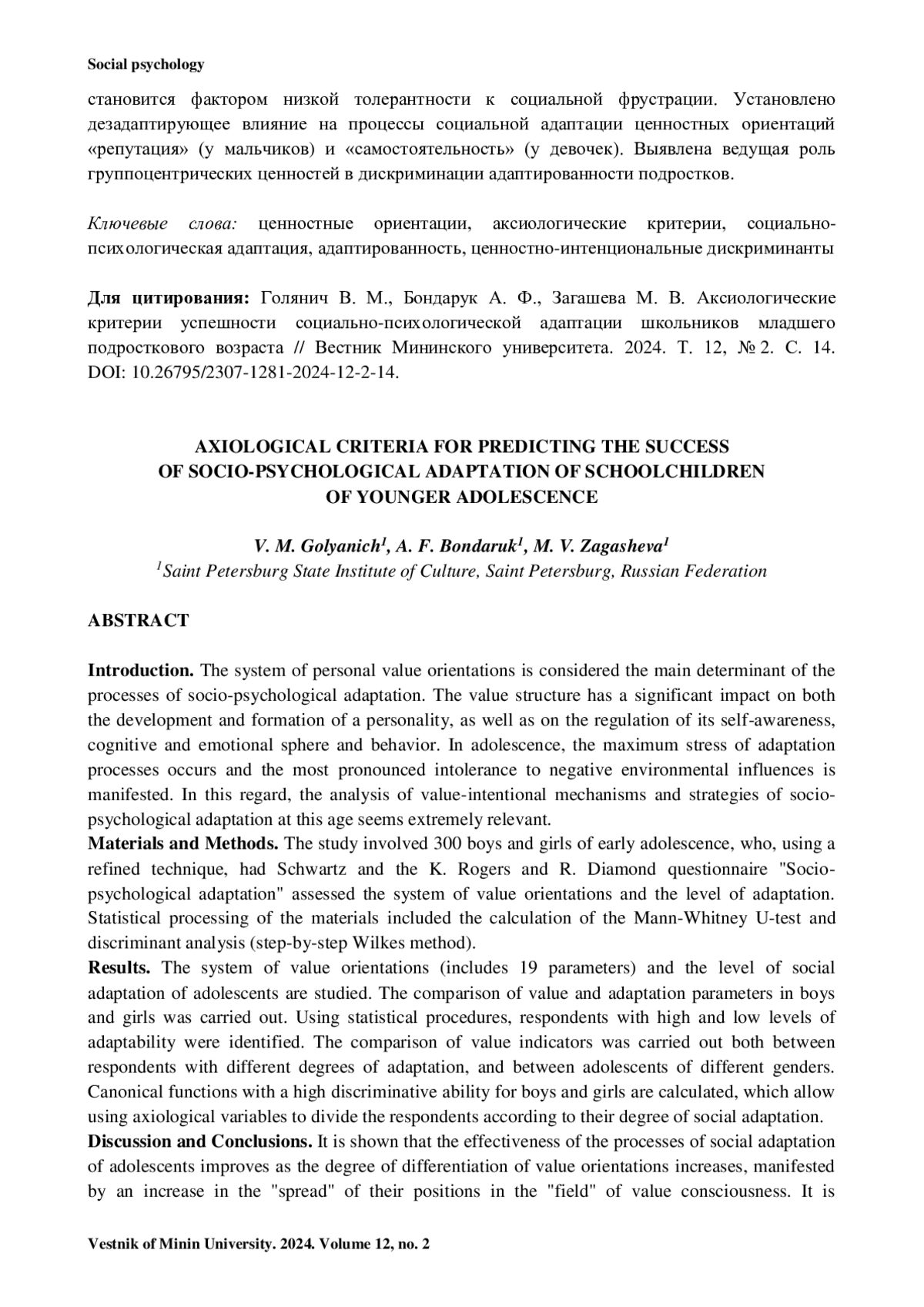 Результаты исследования. Исследована система ценностных ориентаций (включает 19 параметров) и уровень социальной адаптированности подростков. С применением статистических процедур выделены респонденты с высоким и низким уровнями адаптированности. Осуществлено сравнение ценностных показателей как между респондентами с разной степенью адаптированности, так и между подростками разных гендеров. Рассчитаны обладающие высокой дискриминативной способностью канонические функции, позволяющие с использованием аксиологических переменных разделить респондентов по степени их социальной адаптированности.