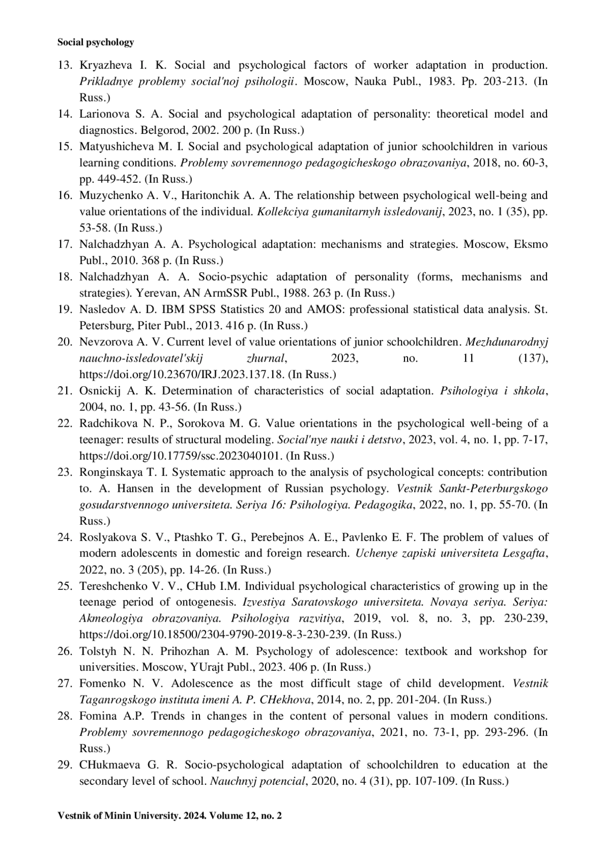 2. Баева И. А., Ульянина О. А., Вихристюк О. В., Гаязова Л. А., Радчикова Н. П. Файзуллина К. А. Факторы социально-психологической дезадаптации и ценностные ориентации подростков и молодежи // Известия Российского государственного педагогического университета им. А. И. Герцена. 2022. № 206. С. 228-242.