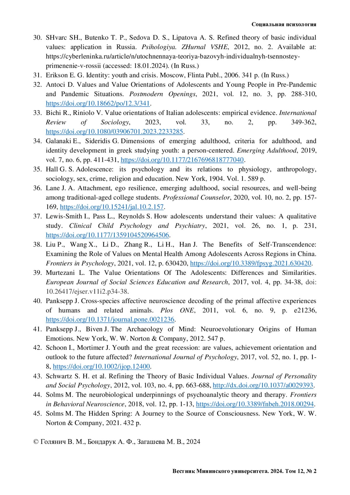 33. Bichi R., Riniolo V. Value orientations of Italian adolescents: empirical evidence // International Review of Sociology. 2023. Vol. 33, no. 2. Pp. 349-362. https://doi.org/10.1080/03906701.2023.2233285.