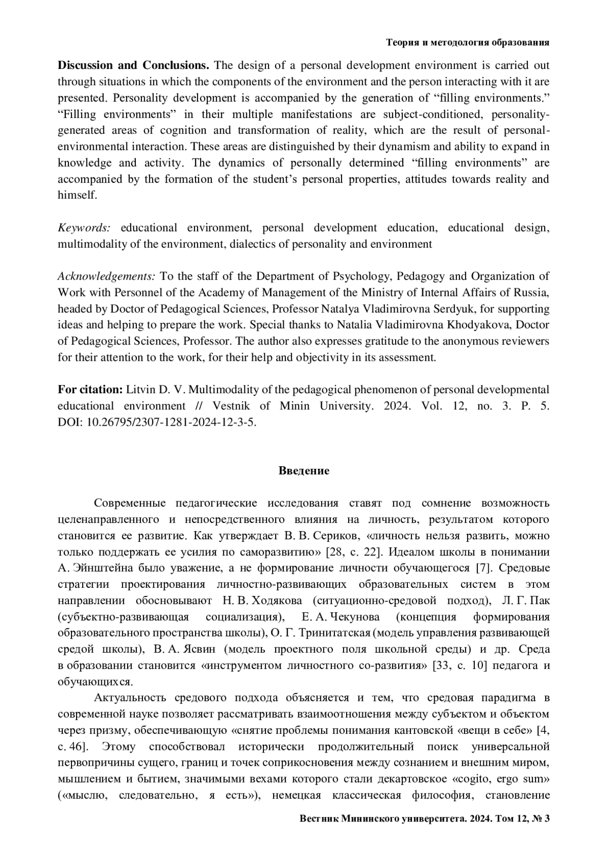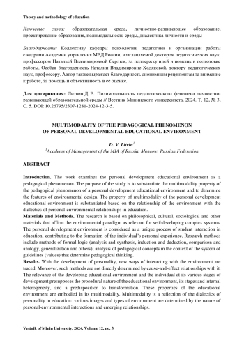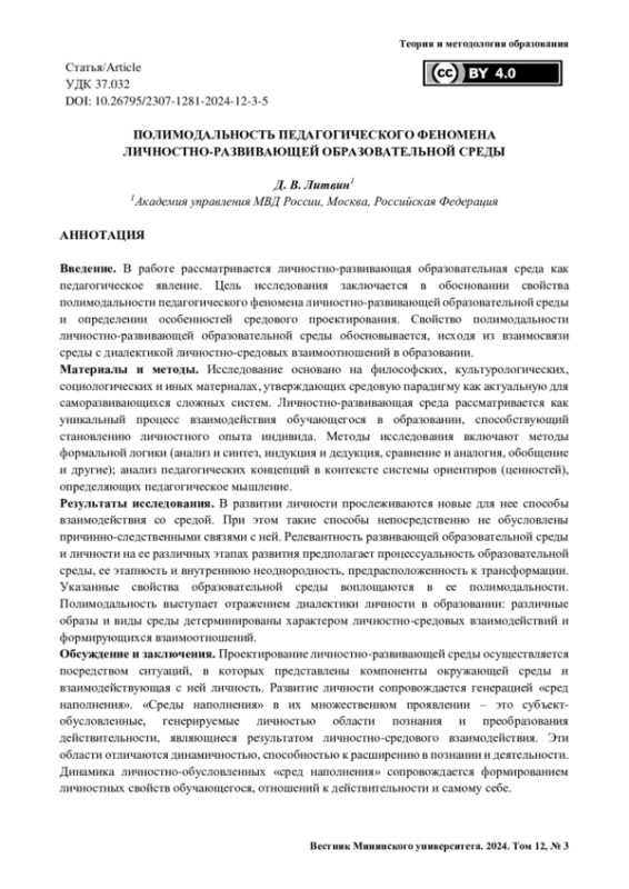 Результаты исследования. В развитии личности прослеживаются новые для нее способы взаимодействия со средой. При этом такие способы непосредственно не обусловлены причинно-следственными связями с ней. Релевантность развивающей образовательной среды и личности на ее различных этапах развития предполагает процессуальность образовательной среды, ее этапность и внутреннюю неоднородность, предрасположенность к трансформации. Указанные свойства образовательной среды воплощаются в ее полимодальности. Полимодальность выступает отражением диалектики личности в образовании: различные образы и виды среды детерминированы характером личностно-средовых взаимодействий и формирующихся взаимоотношений.