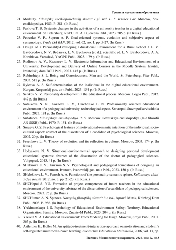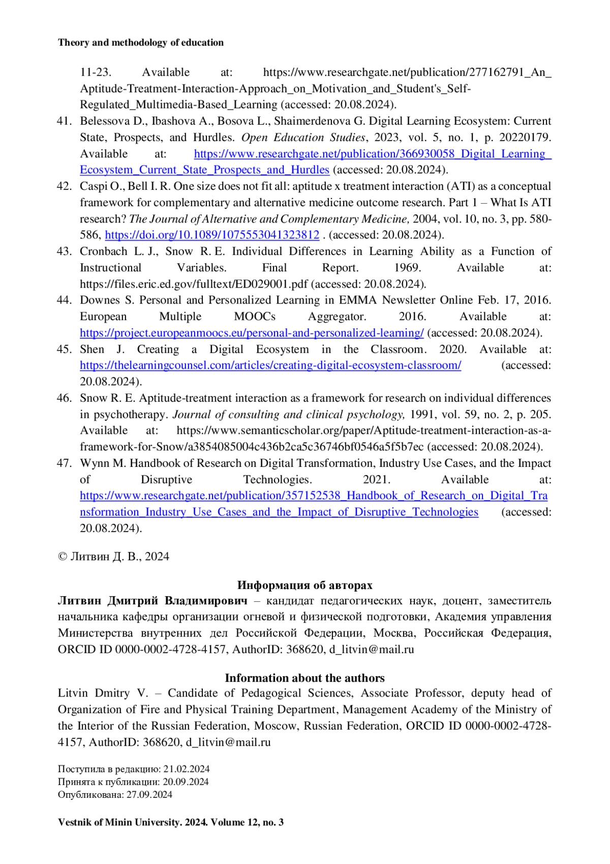 41. Belessova D., Ibashova A., Bosova L., Shaimerdenova G. Digital Learning Ecosystem: Current State, Prospects, and Hurdles // Open Education Studies. 2023. Vol. 5, no. 1. P. 20220179. Available at: https://www.researchgate.net/publication/366930058_Digital_Learning_Ecosystem_Current_State_Prospects_and_Hurdles (accessed: 20. 08. 2024).
