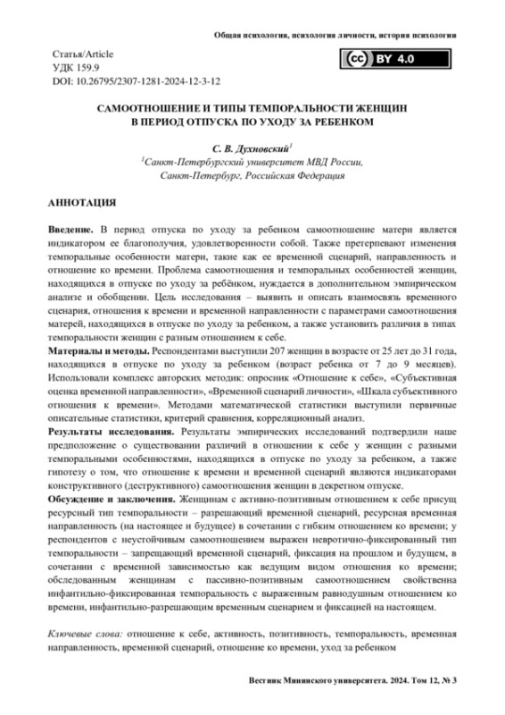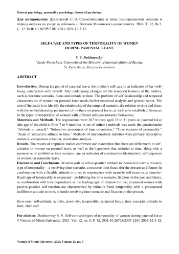 Введение. В период отпуска по уходу за ребенком самоотношение матери является индикатором ее благополучия, удовлетворенности собой. Также претерпевают изменения темпоральные особенности матери, такие как ее временной сценарий, направленность и отношение ко времени. Проблема самоотношения и темпоральных особенностей женщин, находящихся в отпуске по уходу за ребёнком, нуждается в дополнительном эмпирическом анализе и обобщении.