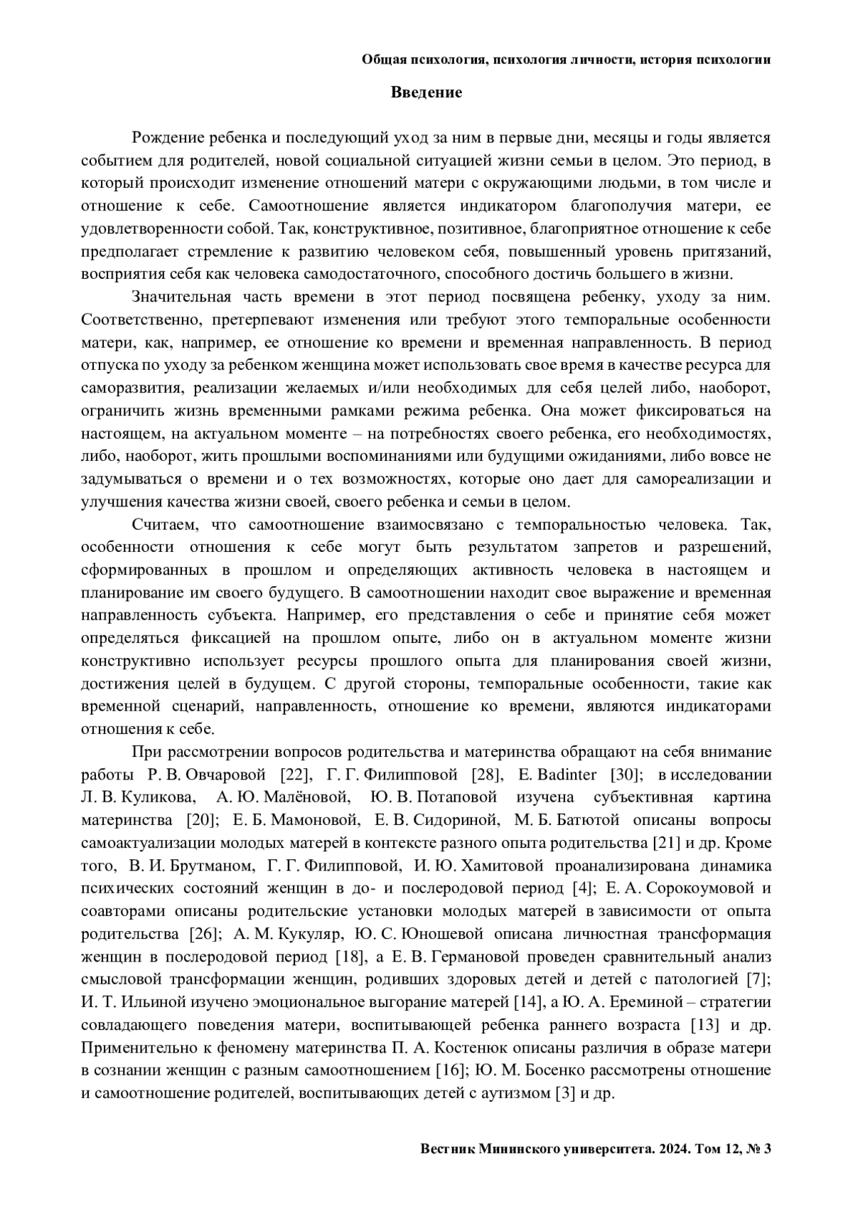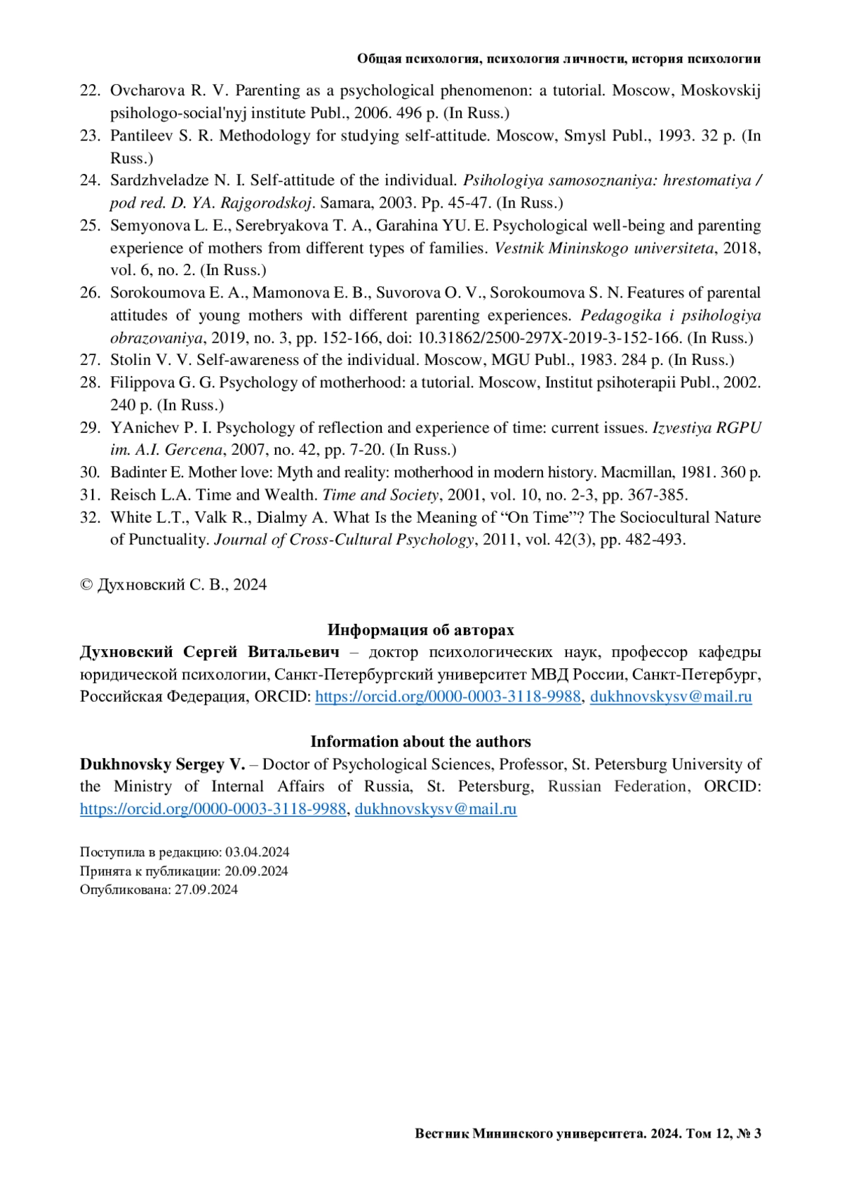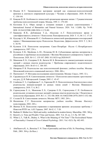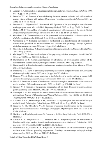 16. Костенюк П. А. Образ матери в сознании женщин с разным самоотношением // International Journal of Humanities and Natural Sciences. 2024. Vol. 1-2(88). Pp. 74-80. https://doi.org/10.24412/2500-1000-2024-1-2-74-80.