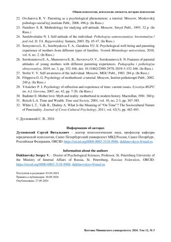 12. Духновкий С. В. Типы темпоральности личности: оценка и перспективы и использования // Российский девиантологический журнал. 2023. № 4(3). С. 384-393.