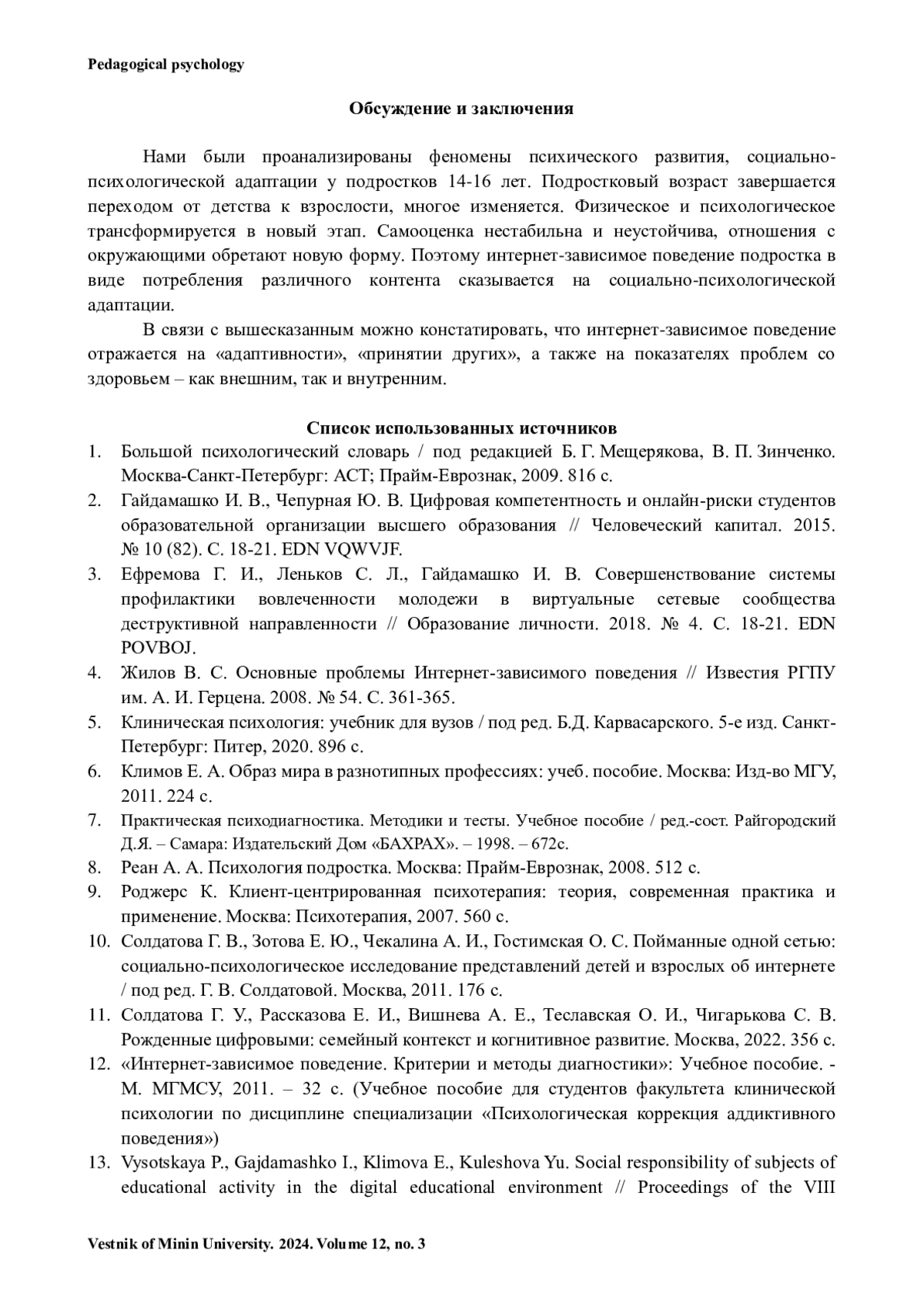 11. Солдатова Г. У., Рассказова Е. И., Вишнева А. Е., Теславская О. И., Чигарькова С. В. Рожденные цифровыми: семейный контекст и когнитивное развитие. Москва, 2022. 356 с.