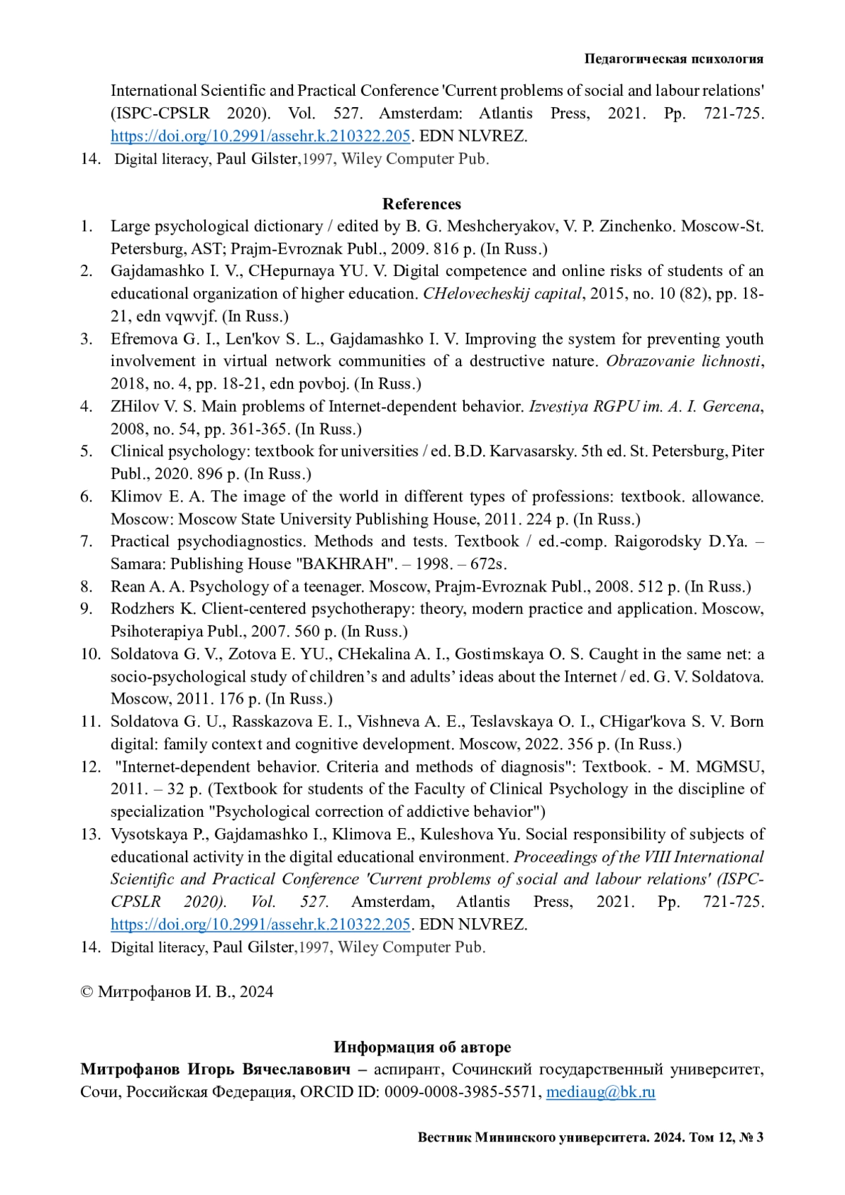 2. Гайдамашко И. В., Чепурная Ю. В. Цифровая компетентность и онлайн-риски студентов образовательной организации высшего образования // Человеческий капитал. 2015. № 10 (82). С. 18-21. EDN: VQWVJF.