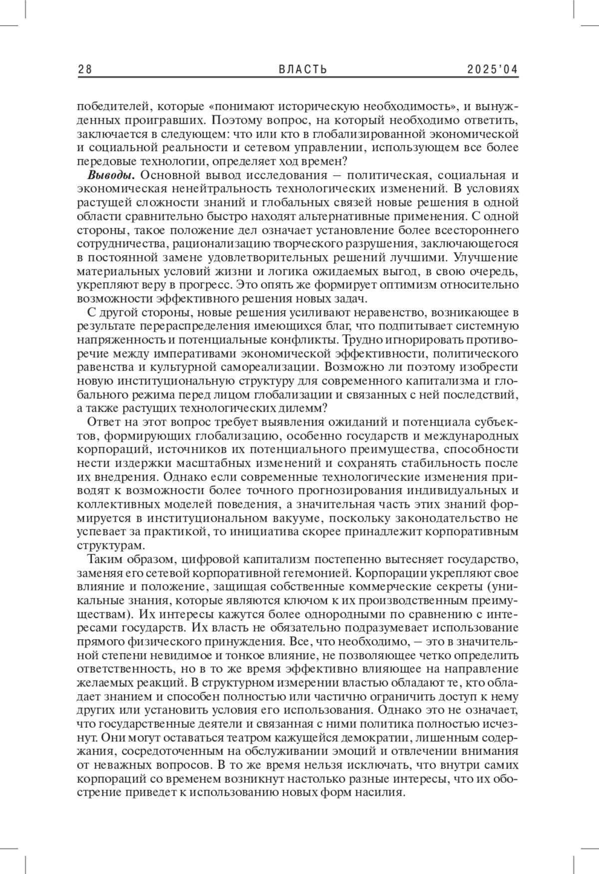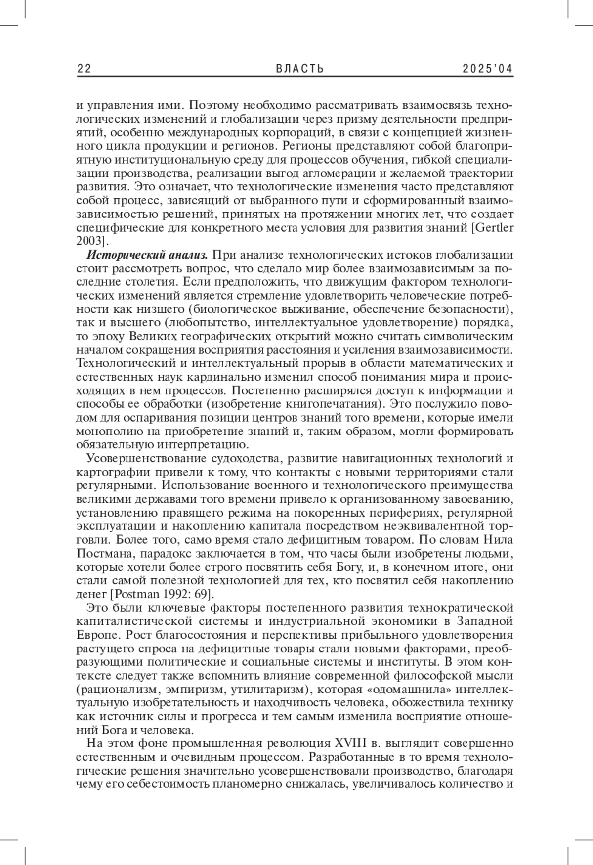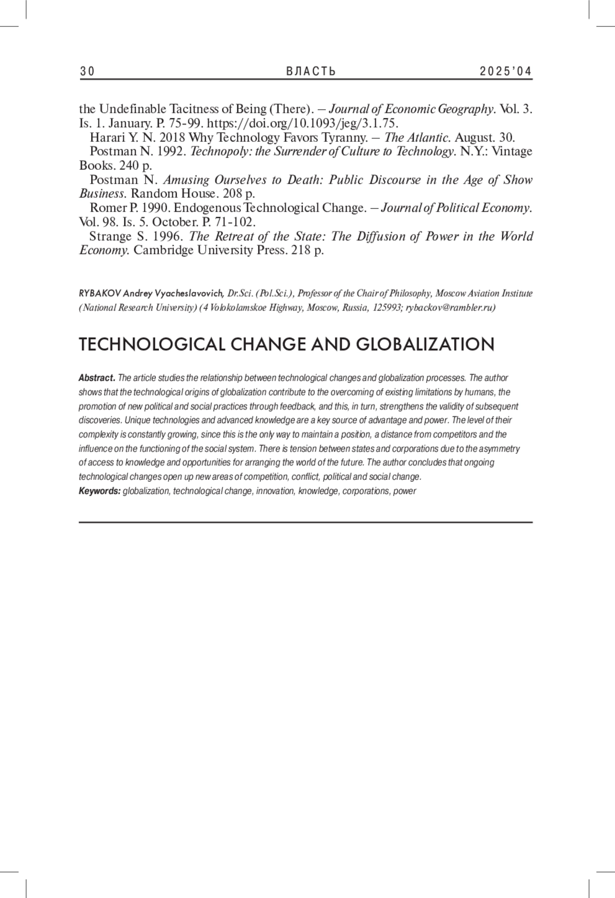 Статья посвящена исследованию взаимосвязи технологических изменений и процессов глобализации. Показано, что технологические истоки глобализации способствуют преодолению человеком существующих ограничений, продвижению новых политических и социальных практик посредством обратной связи, а это, в свою очередь, укрепляет обоснованность последующих открытий. Уникальные технологии и передовые знания являются ключевым источником преимущества и власти. Уровень их сложности постоянно растет, поскольку это единственный способ сохранить позицию, дистанцию от конкурентов и влияние на функционирование общественной системы. Между государствами и корпорациями существует напряженность, обусловленная асимметрией доступа к знаниям и возможностям обустройства мира будущего. Автор делает вывод, что продолжающиеся технологические изменения открывают новые сферы конкуренции, конфликтов, политических и социальных изменений.