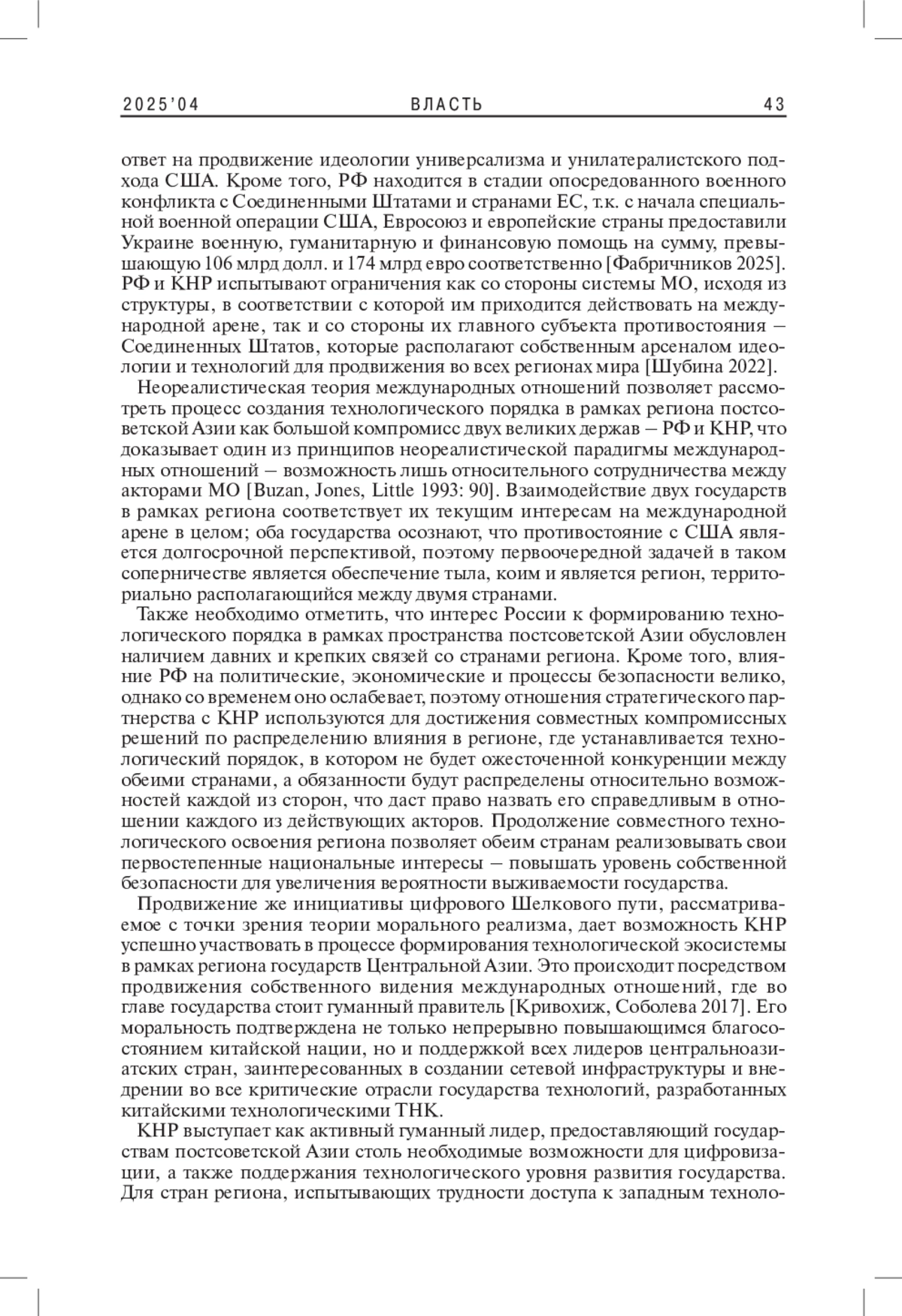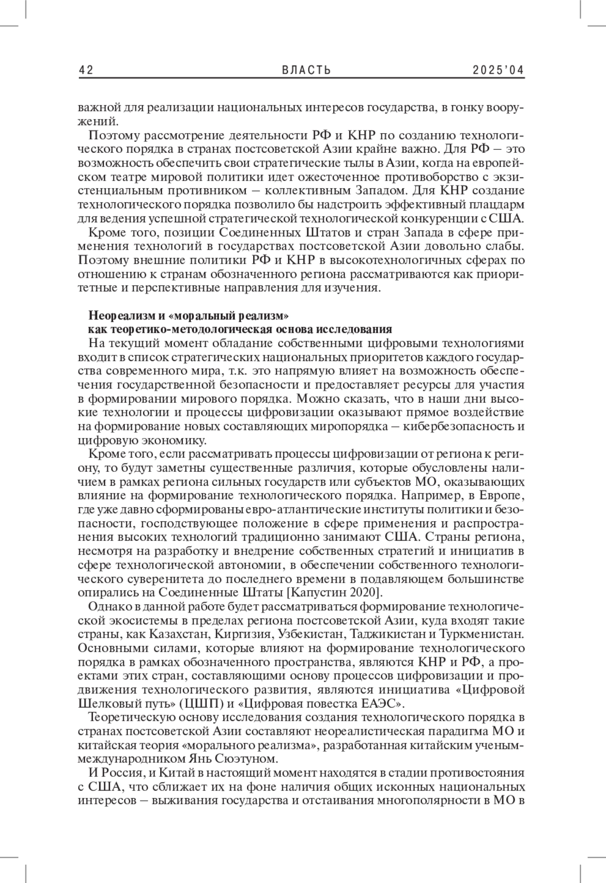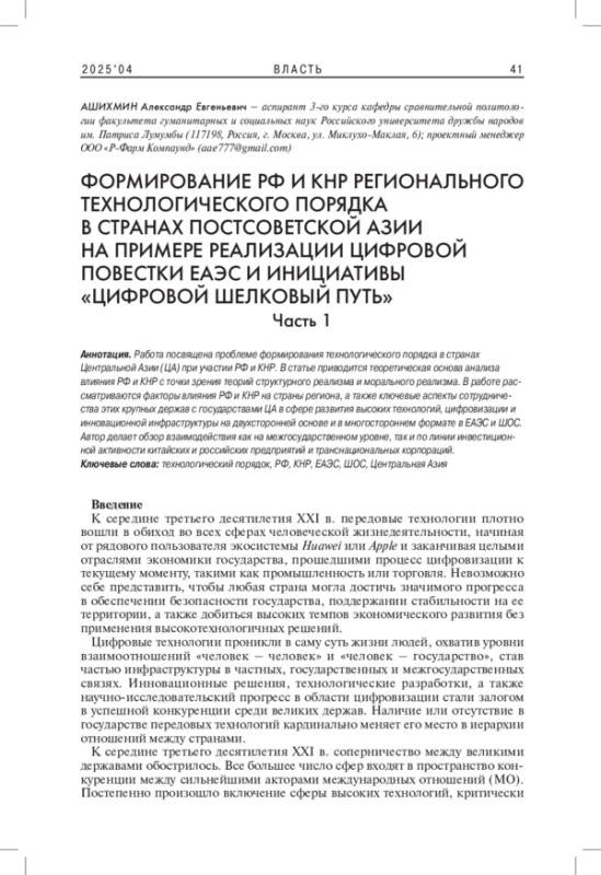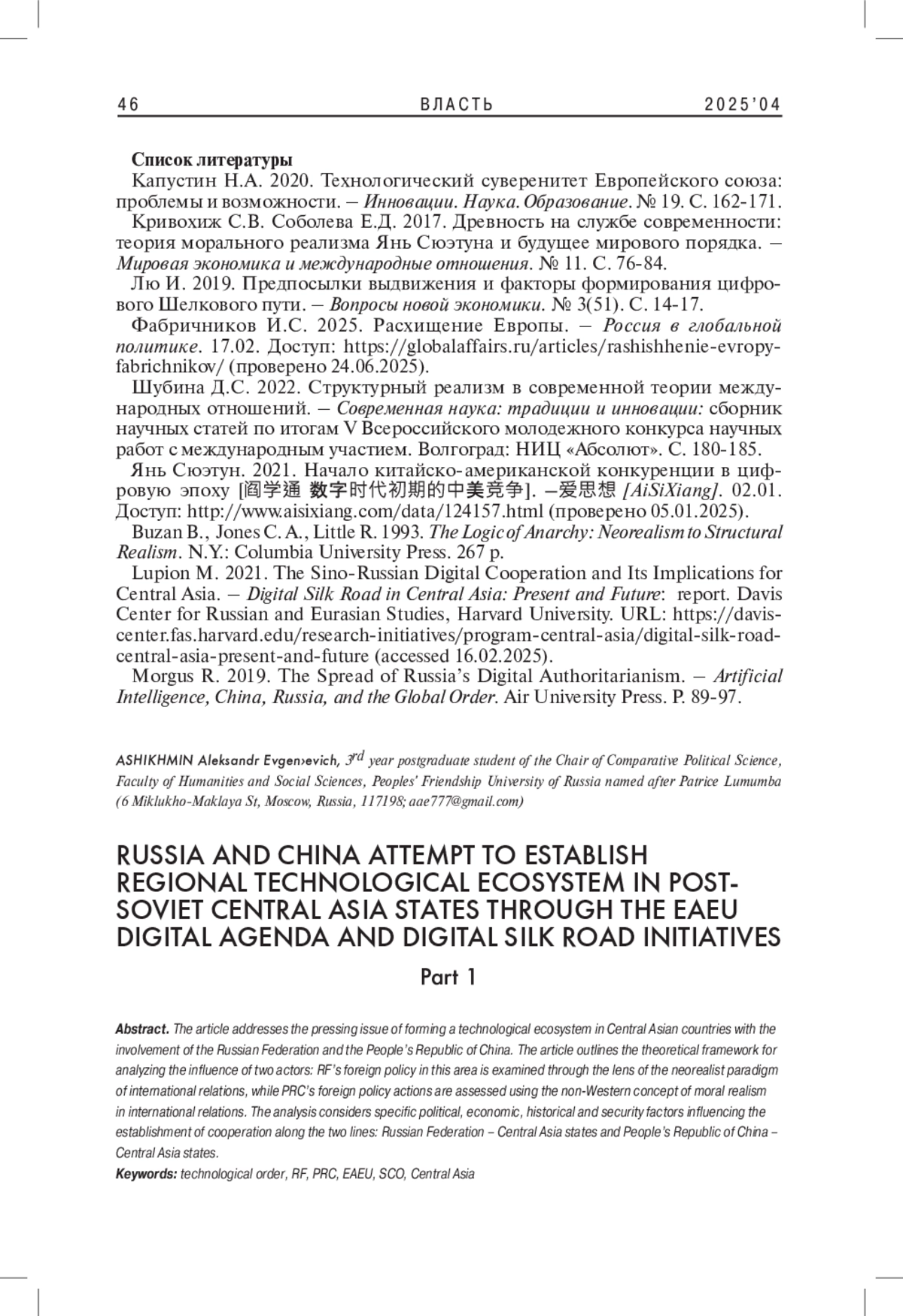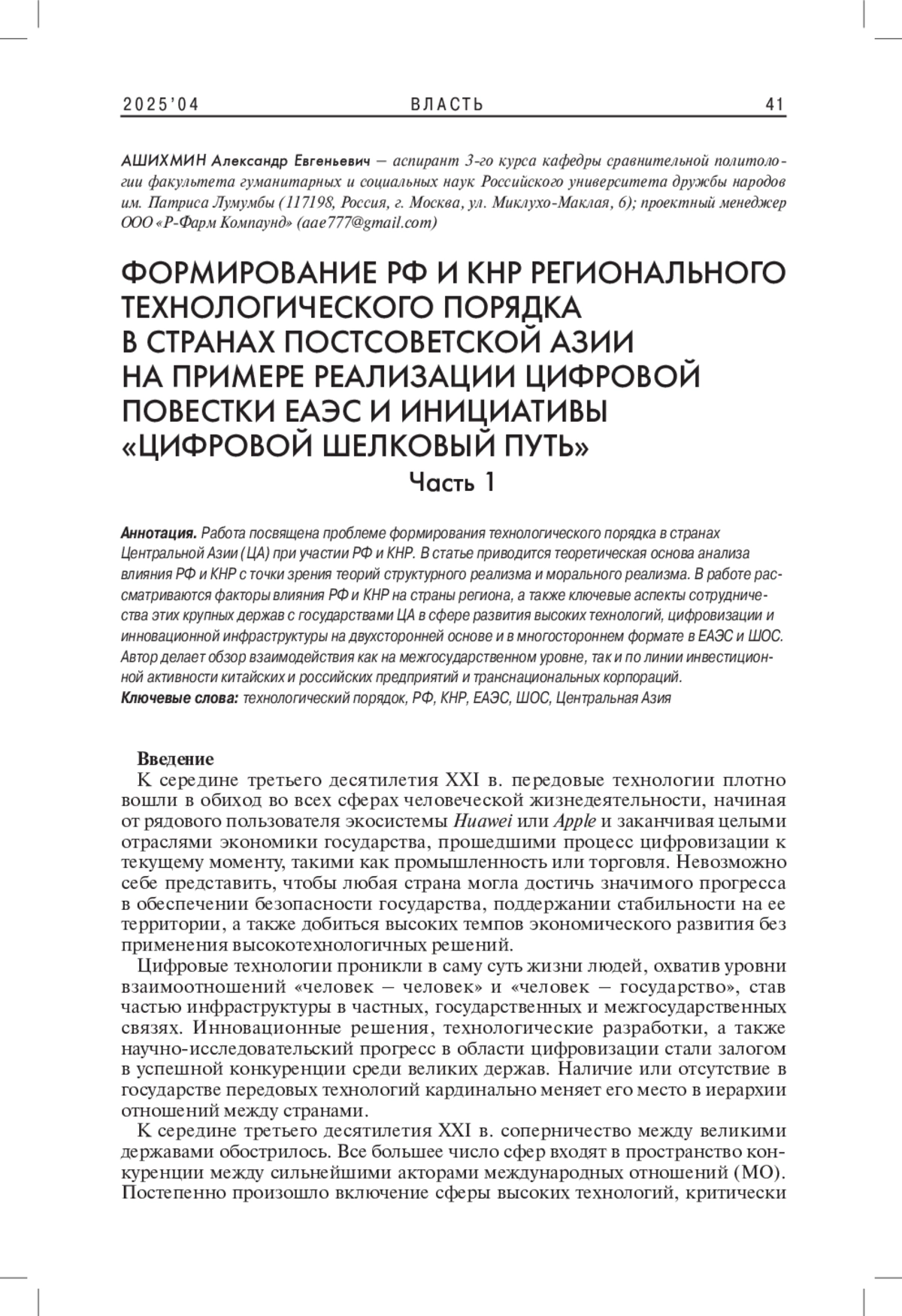 Работа посвящена проблеме формирования технологического порядка в странах Центральной Азии (ЦА) при участии РФ и КНР. В статье приводится теоретическая основа анализа влияния РФ и КНР с точки зрения теорий структурного реализма и морального реализма. В работе рассматриваются факторы влияния РФ и КНР на страны региона, а также ключевые аспекты сотрудничества этих крупных держав с государствами ЦА в сфере развития высоких технологий, цифровизации и инновационной инфраструктуры на двухсторонней основе и в многостороннем формате в ЕАЭС и ШОС. Автор делает обзор взаимодействия как на межгосударственном уровне, так и по линии инвестиционной активности китайских и российских предприятий и транснациональных корпораций.
