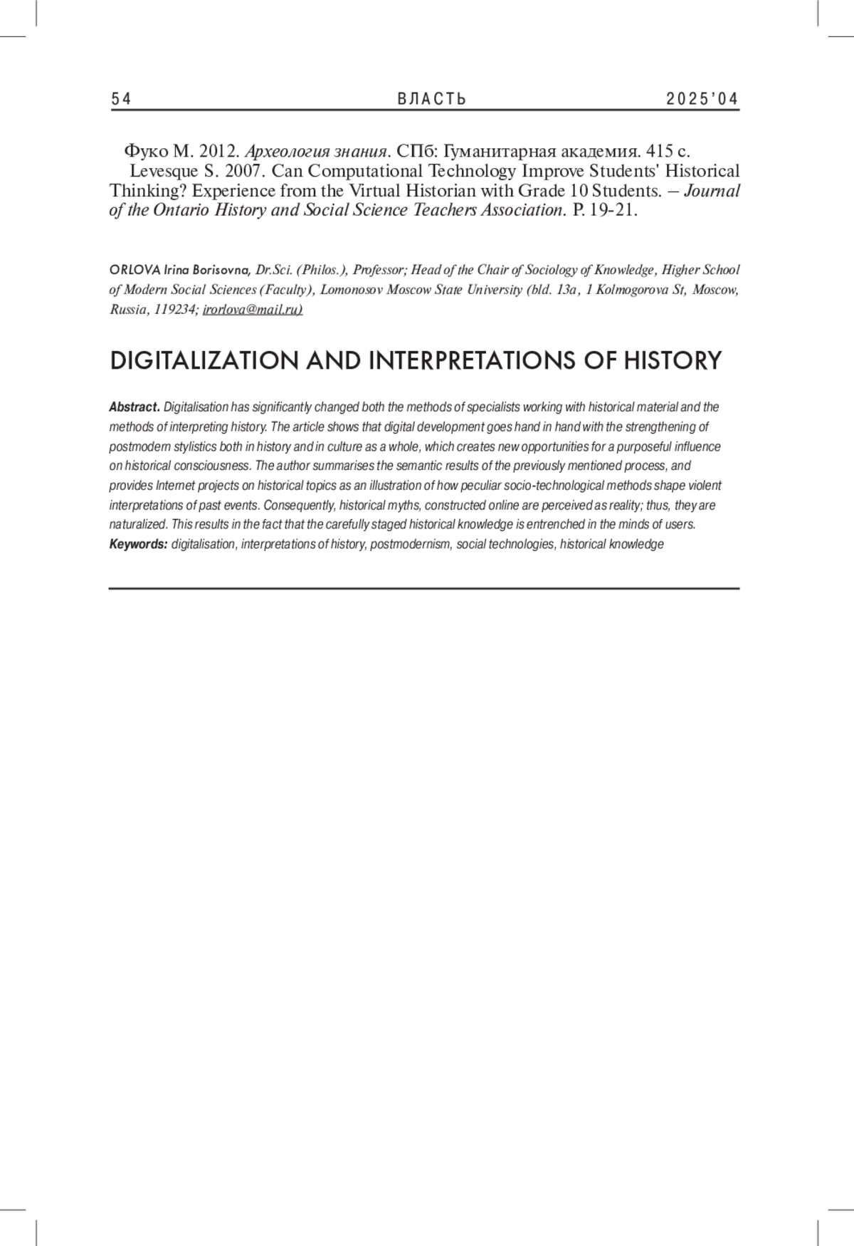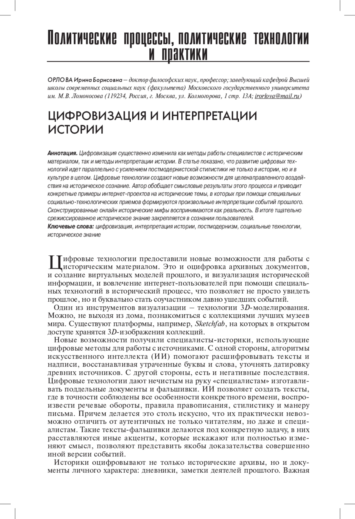 Цифровизация существенно изменила как методы работы специалистов с историческим материалом, так и методы интерпретации истории. В статье показано, что развитие цифровых технологий идет параллельно с усилением постмодернистской стилистики не только в истории, но и в культуре в целом. Цифровые технологии создают новые возможности для целенаправленного воздействия на историческое сознание. Автор обобщает смысловые результаты этого процесса и приводит конкретные примеры интернет-проектов на исторические темы, в которых при помощи специальных социально-технологических приемов формируются произвольные интерпретации событий прошлого. Сконструированные онлайн исторические мифы воспринимаются как реальность. В итоге тщательно срежиссированное историческое знание закрепляется в сознании пользователей.