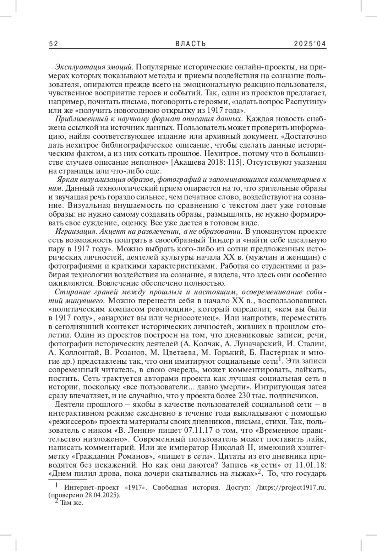 1. 	Акашева А.А. 2018. Сетевой проект “1917. Свободная история”, или как конструировать историю в массовом сознании интернет-пользователей. - Историческая информатика. № 4. С. 111-122.