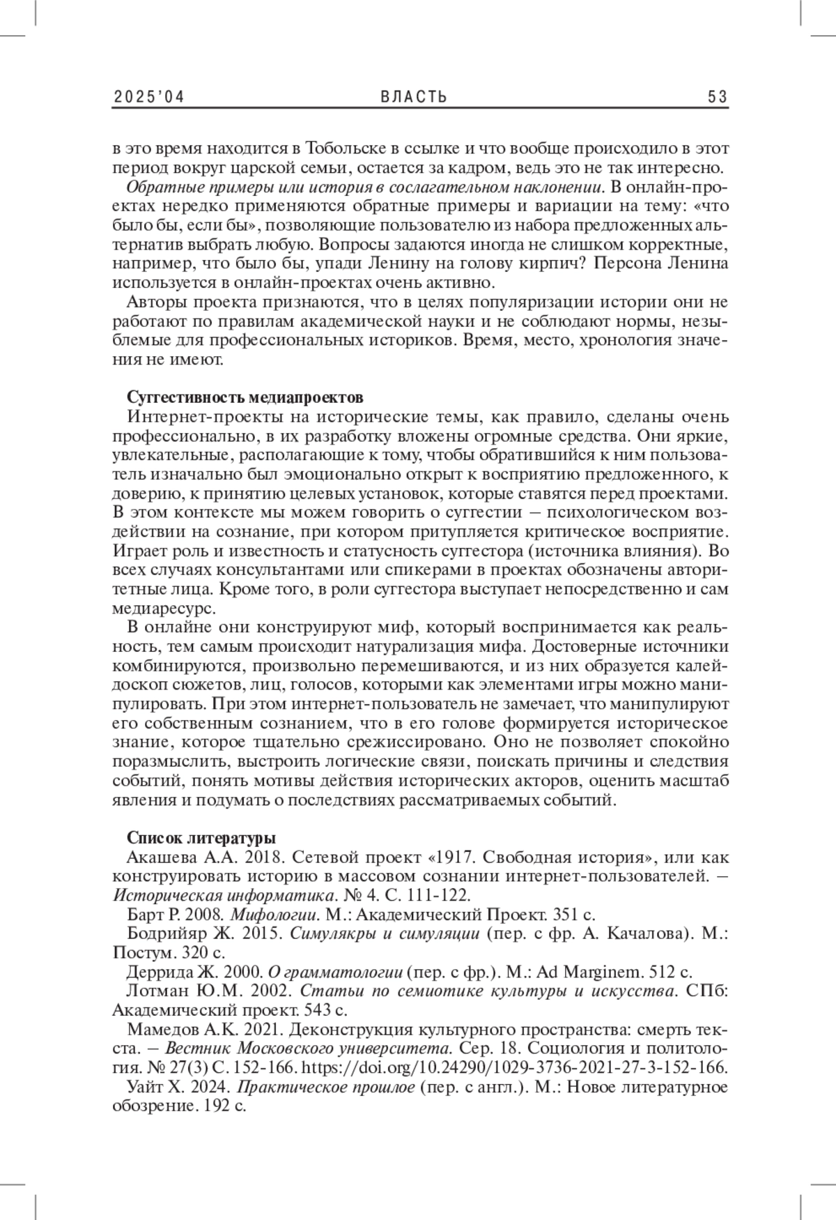 6. 	Мамедов А.К. 2021. Деконструкция культурного пространства: смерть текста. - Вестник Московского университета. Сер. 18. Социология и политология. № 27(3) С. 152-166. DOI: 10.24290/1029-3736-2021-27-3-152-166